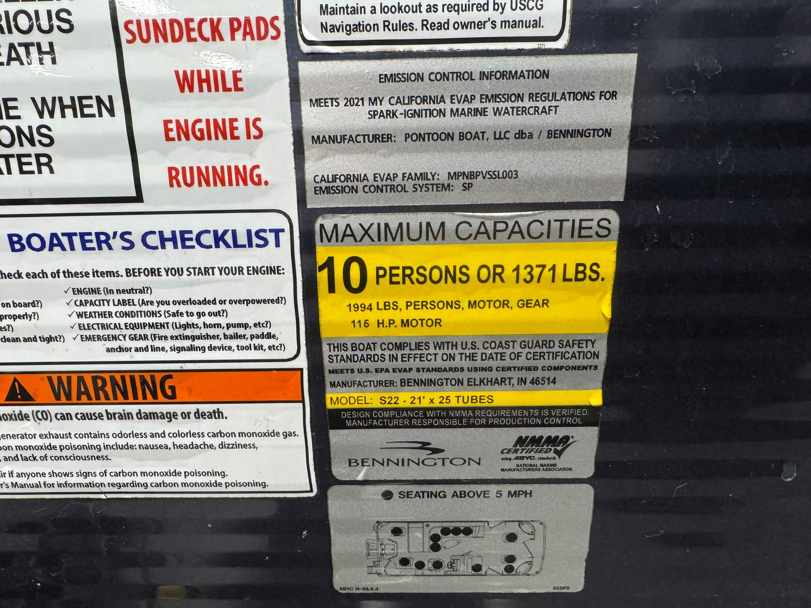 At the heart of the Bennington 22 SXF is a single, robust engine delivering 90 horsepower. This setup strikes the perfect balance between fuel efficiency and spirited performance, allowing you to cruise comfortably across lakes, rivers, or coastal waters. The 90 HP engine provides smooth acceleration and responsive handling, making it easy to navigate tight marinas or open stretches of water. Whether you are towing a tube, heading to your favorite fishing spot, or simply enjoying a leisurely cruise, the Bennington 22 SXF offers the power and reliability you need for a wide range of activities.