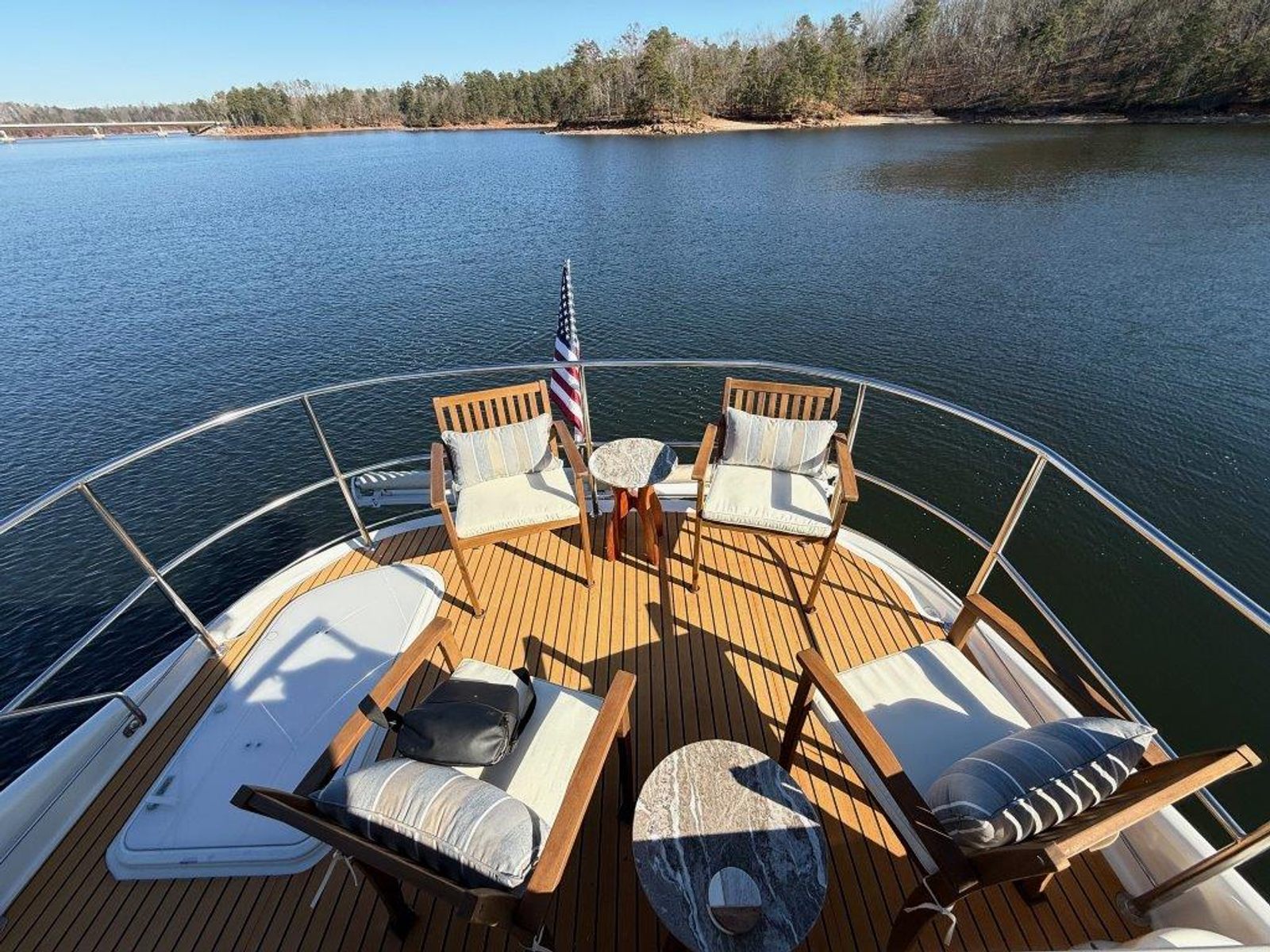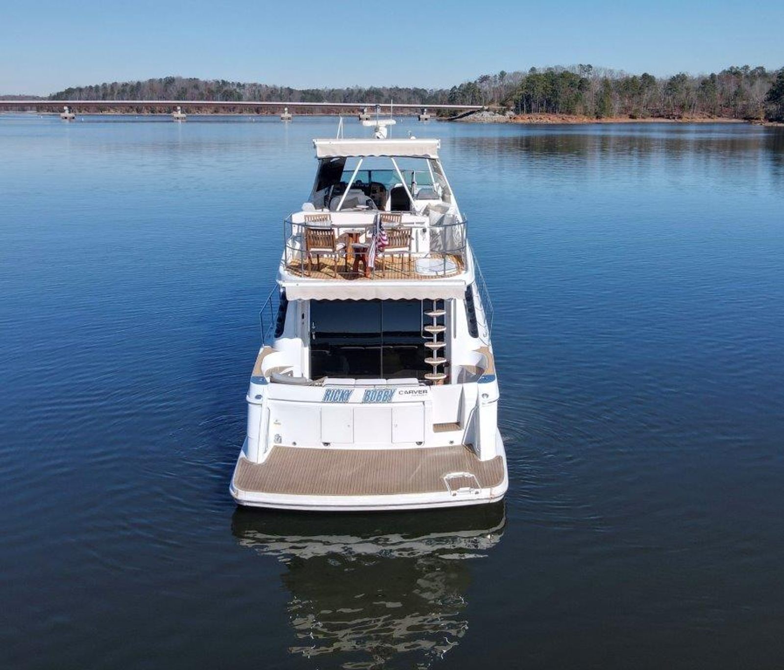 Below deck, the yacht features a three-stateroom layout, generous pilothouse seating, and a full-beam master suite, making her ideal for extended cruising or luxury liveaboard use. Her previous owner brought her down from Tennessee, and she currently resides under cover on Lake Lanier, preserving her freshwater condition.