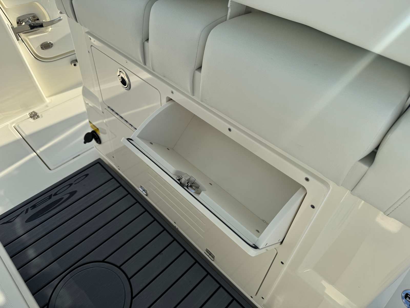 At the heart of the Cobia 245 CC’s exhilarating performance are twin Yamaha 150XSA2 engines, finished in a striking white. Together, these engines deliver a combined 300 horsepower, providing the thrust and agility needed for a wide range of activities, from high-speed runs to leisurely cruises. The inclusion of the Helm Master EX DES twin engine system with ISO charger ensures precise control and seamless maneuverability, making docking and navigation effortless. Digital electric steering offers a smooth, responsive feel at the helm, while the upgraded Edson steering wheel with a stainless power knob adds a touch of luxury and ergonomic comfort. Whether you are chasing the horizon or navigating tight marinas, the Cobia 245 CC’s performance package is designed to inspire confidence and excitement.