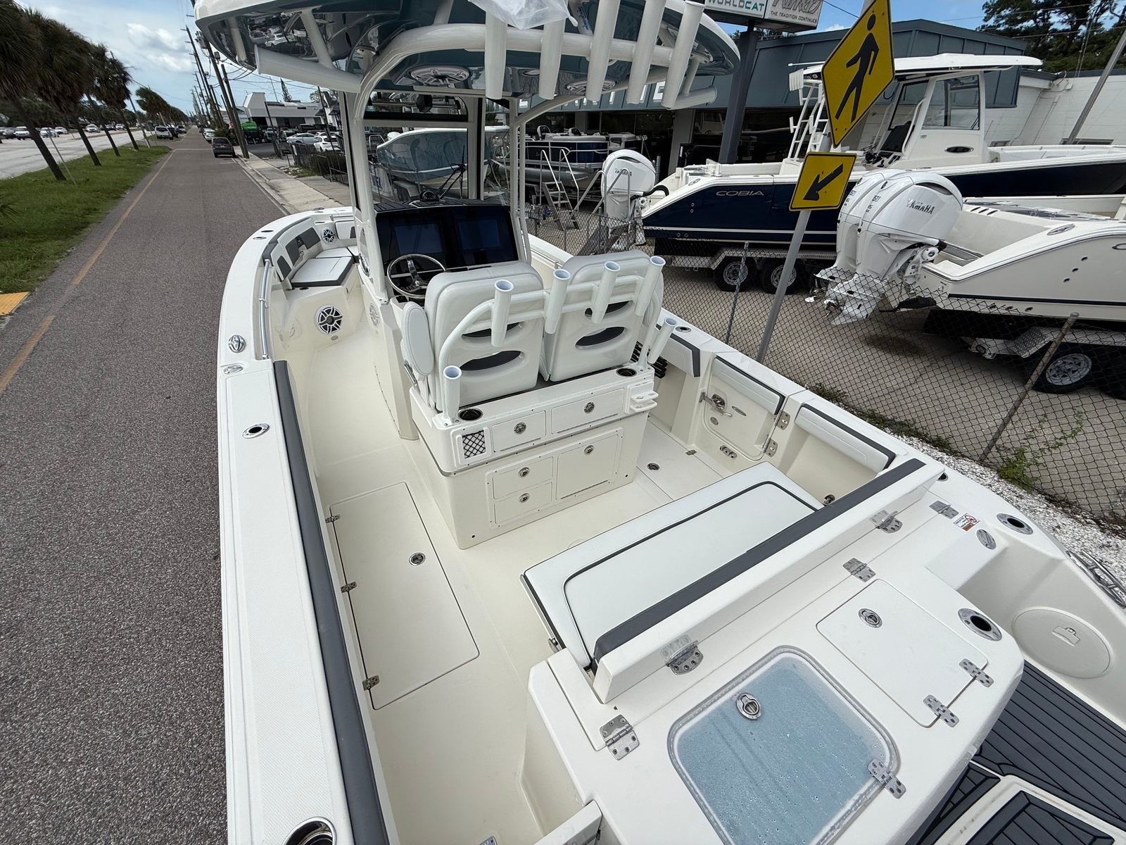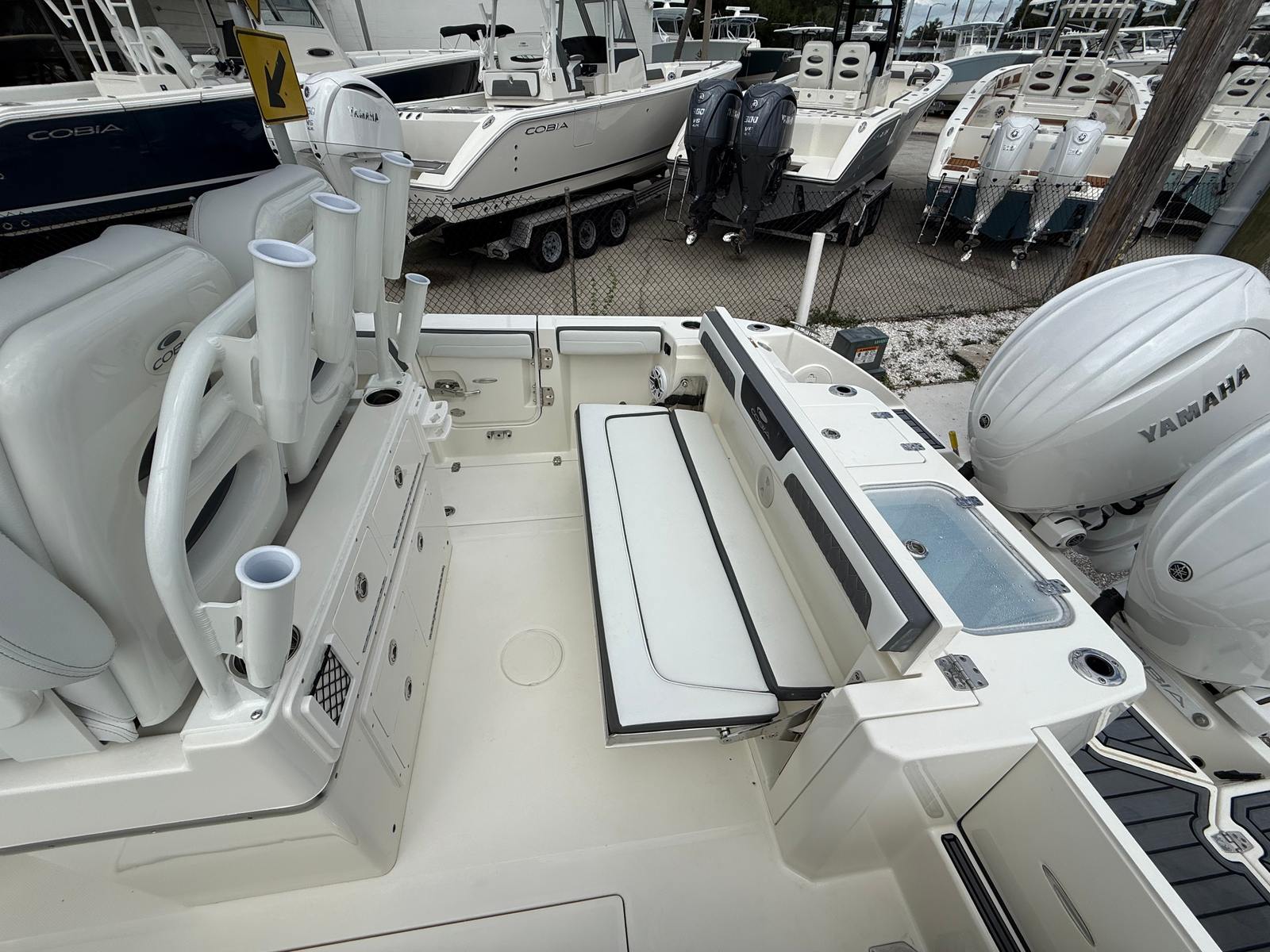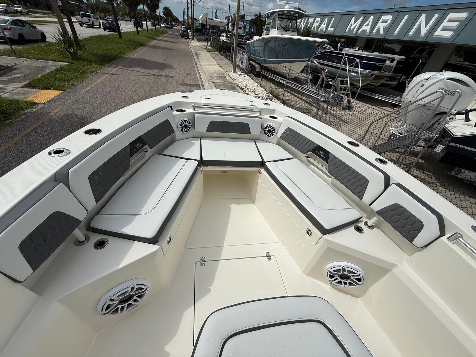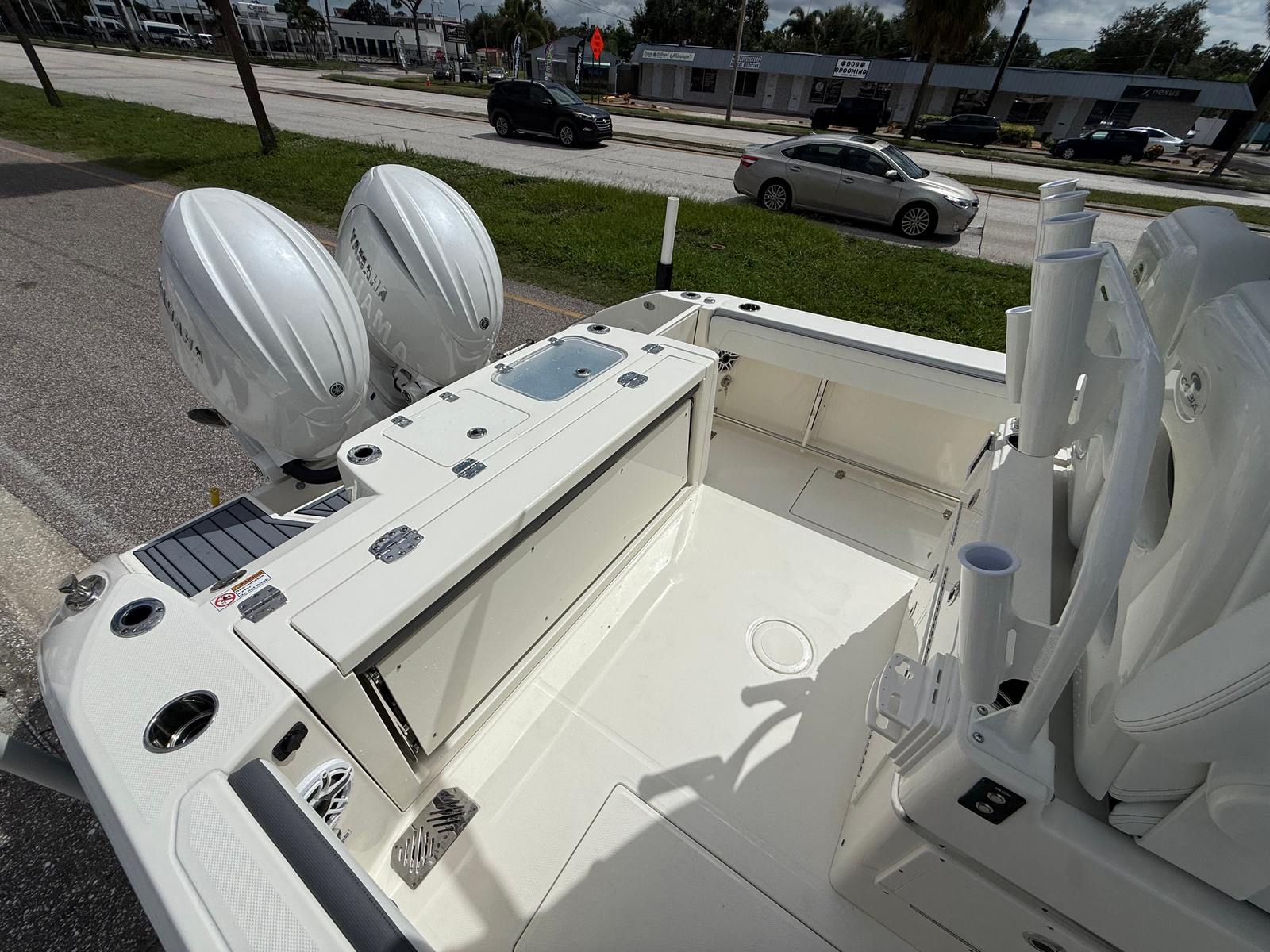 Powering the Cobia 265 CC are twin Yamaha 200XSA2 engines, finished in striking white for a clean, contemporary aesthetic. With a combined 400 horsepower, this Center Console boat is engineered for exhilarating speed and smooth handling. The advanced EX DES Twin Engine system with ISO Charge ensures reliable power delivery and optimal efficiency, while the digital electric steering offers precise control for effortless navigation. Whether you’re cruising along the coastline or heading offshore for a day of fishing, the Cobia 265 CC’s performance capabilities are sure to impress.