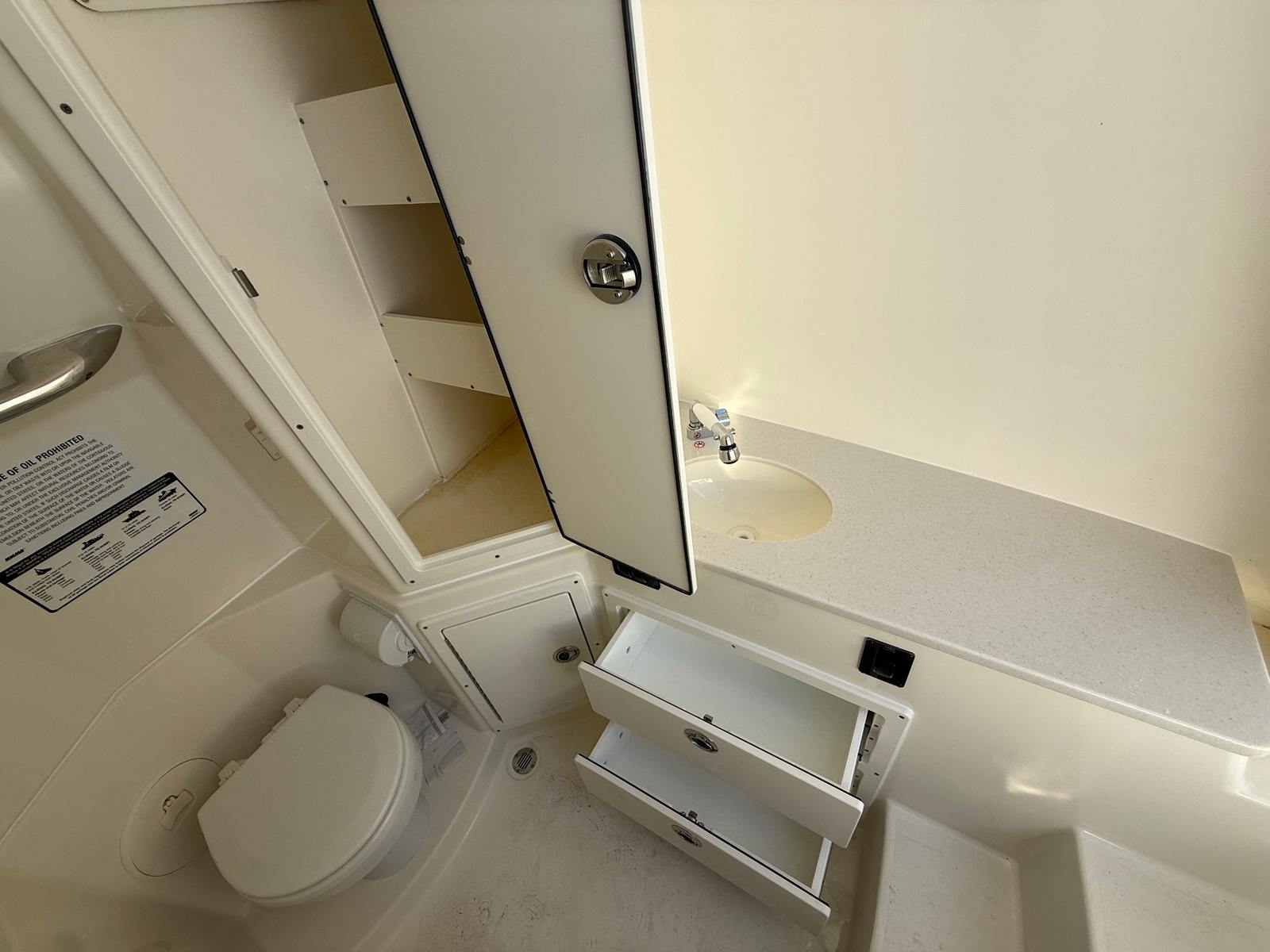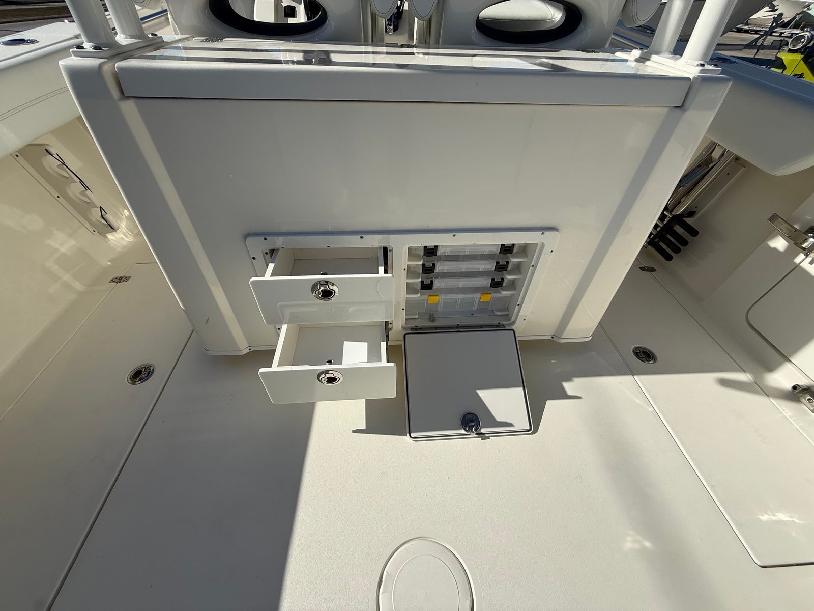 Practicality is at the core of the Cobia 320 CC’s design. The Center Console layout maximizes deck space, providing plenty of storage for gear, tackle, and personal items. The fresh water washdown for the windlass simplifies maintenance and keeps your boat looking its best. The advanced battery system ensures that all your electronics and accessories have the power they need, while the wireless phone charger adds a layer of convenience for today’s connected lifestyle.Docking and maneuvering are made easy with the Helm Master EX system, which includes Auto Pilot and Joystick controls. Whether you are navigating a busy marina or anchoring in a secluded cove, you will appreciate the precision and ease of handling that this system provides. The underwater blue lights not only enhance the boat’s appearance but also improve visibility during nighttime activities, adding both safety and style to your adventures.