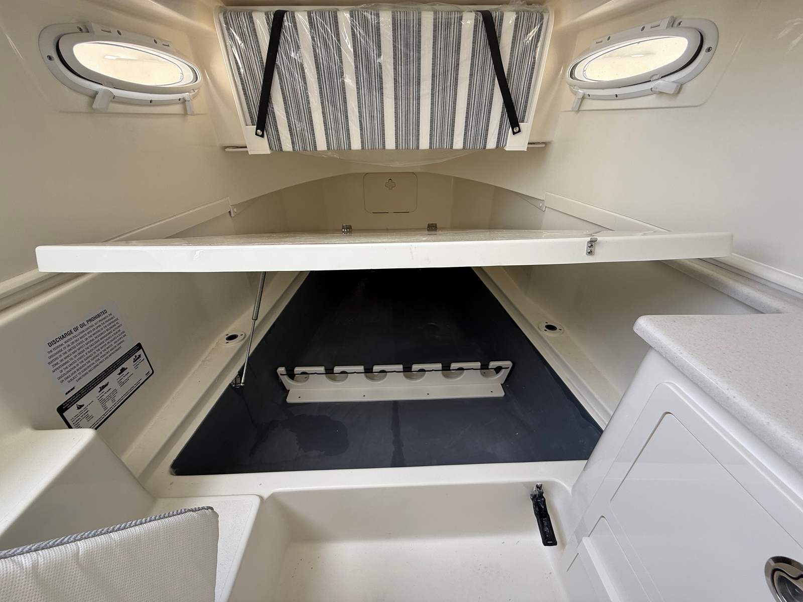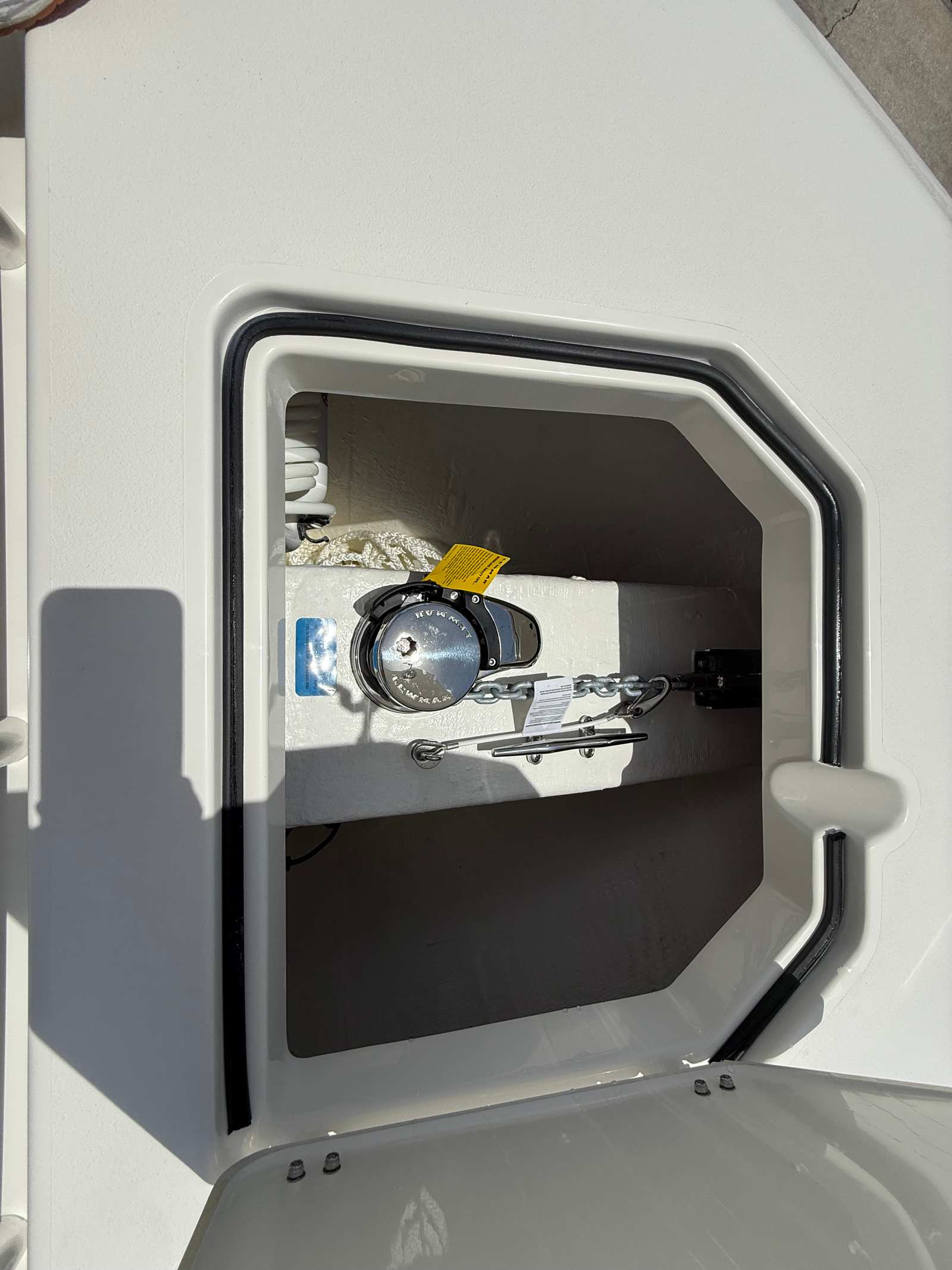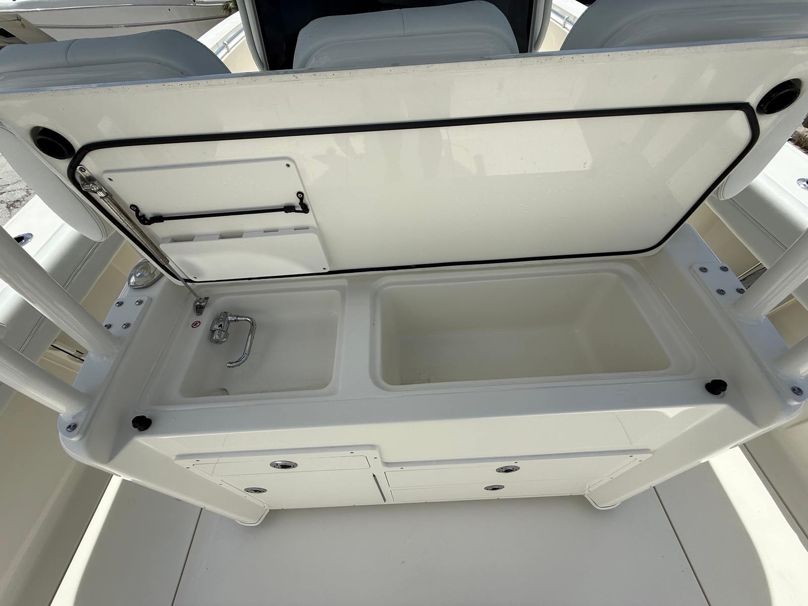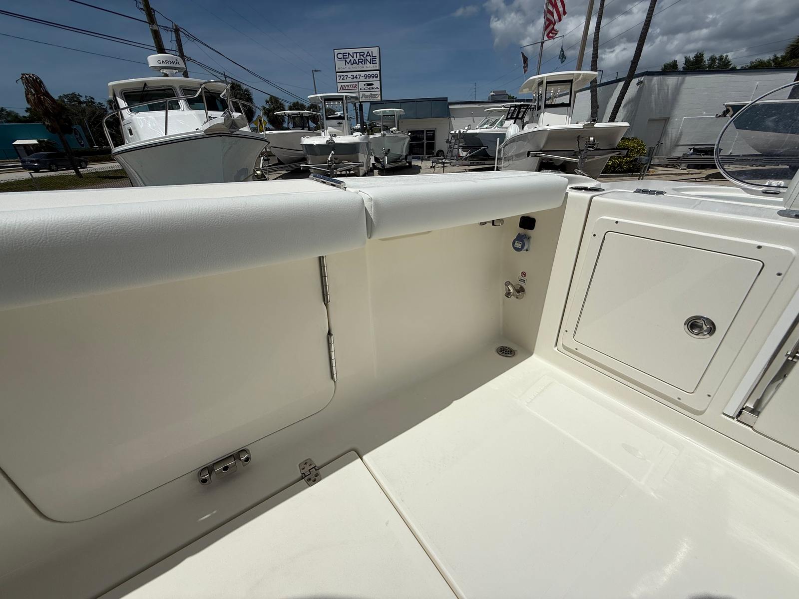 The Cobia 350 CC is loaded with features that set it apart in the world of center console boats for sale. The Bayside Blue hull color not only turns heads but also reflects Cobia’s attention to style and detail. The twin Yamaha XF450NSA2 engines in white are complemented by the Helm Master EX system, which integrates seamlessly with the digital electric steering and joystick for unmatched control. The autopilot feature allows for hands-free navigation, making long journeys more comfortable and enjoyable. The GEM stainless steel trim tabs ensure optimal performance and handling, while the upgraded white rub rail with stainless steel insert adds both durability and elegance. The interior is equally impressive, with 2-tone Platinum and White cushions providing plush seating, and a forward-facing bow backrest offering additional comfort for passengers. The helm seat tackle station, finished in white, is perfect for anglers who want easy access to their gear without sacrificing style.