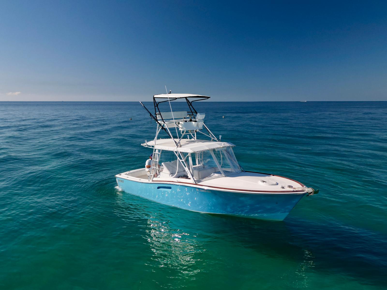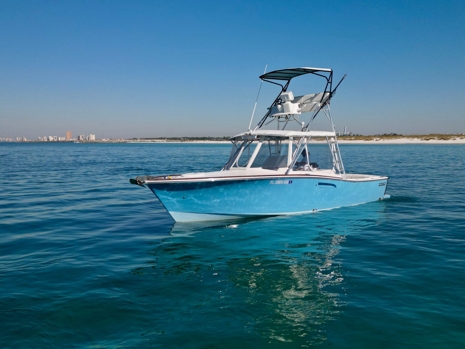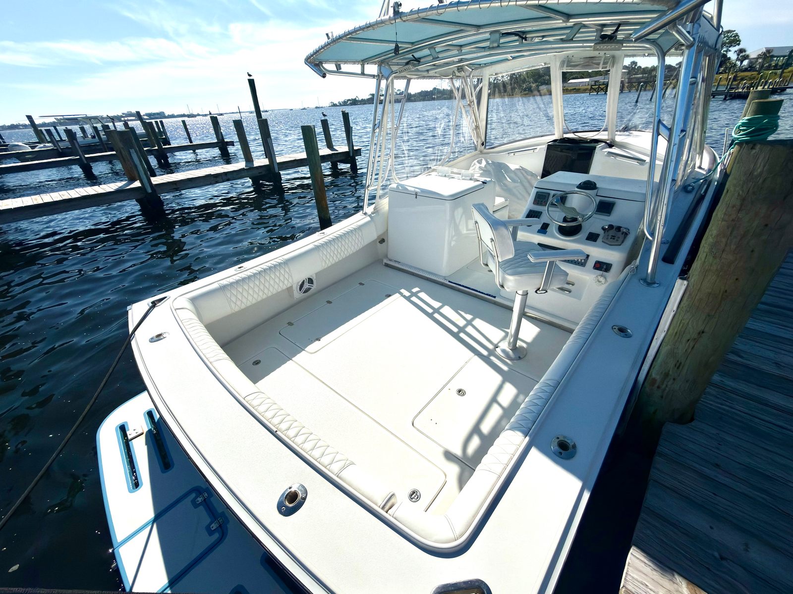 The Deno Express Cuddy is designed with a focus on comfort, convenience, and versatility. Its Cuddy Cabin layout offers a cozy and private space for relaxation, allowing you to escape the sun or enjoy a peaceful nap during your adventures. The spacious deck provides plenty of room for socializing, fishing, or simply soaking up the scenery. The 32-foot length ensures that there’s enough space for all your activities, while the thoughtful design makes every inch of the boat functional and inviting.Special features of the Deno Express Cuddy include its twin-engine setup, which not only boosts performance but also adds a layer of safety and reliability. The cabin area is perfect for storing gear, preparing snacks, or taking a break from the action. The overall build quality reflects Deno’s commitment to craftsmanship, ensuring that this used boat remains a dependable companion for years to come.