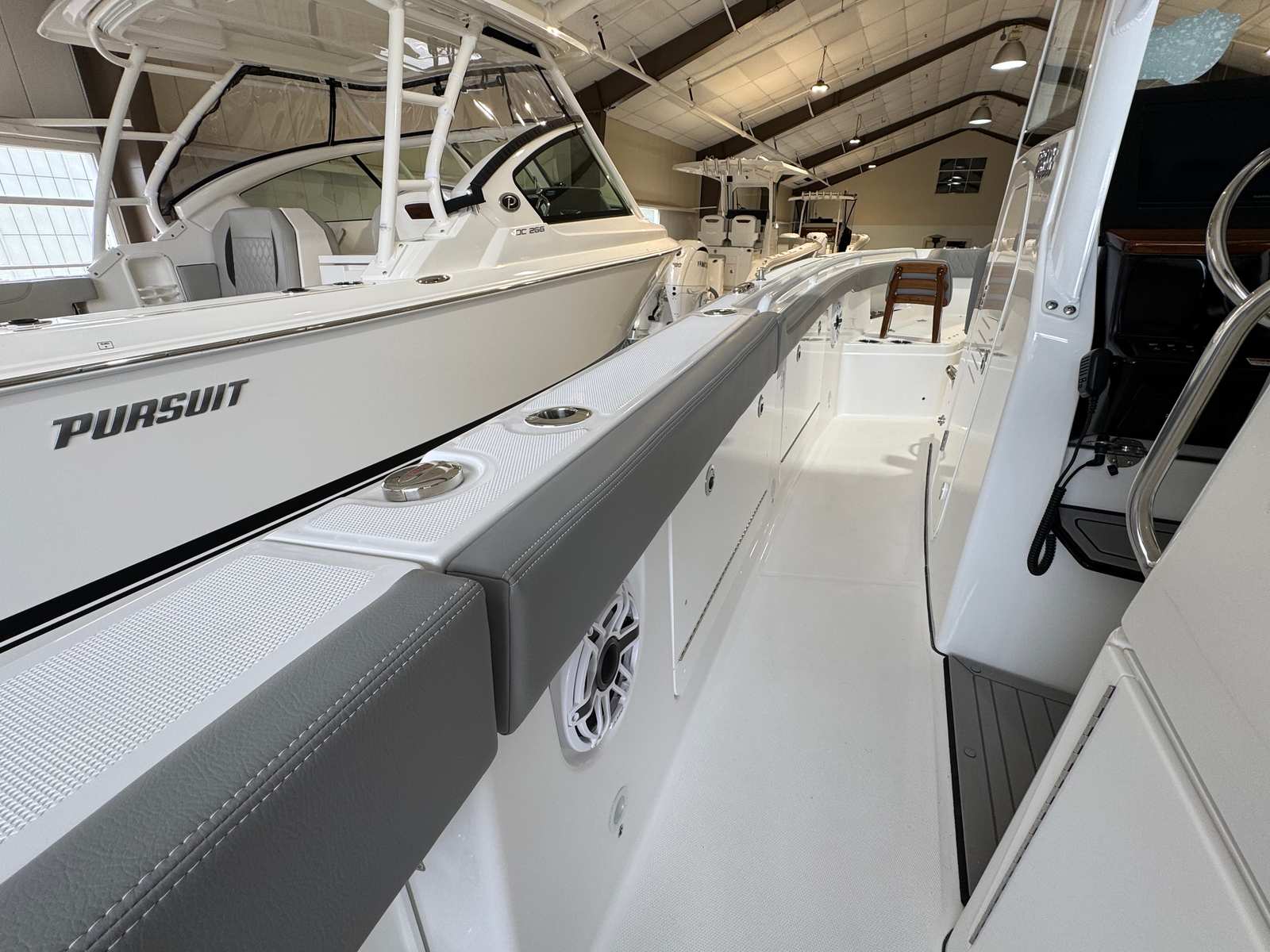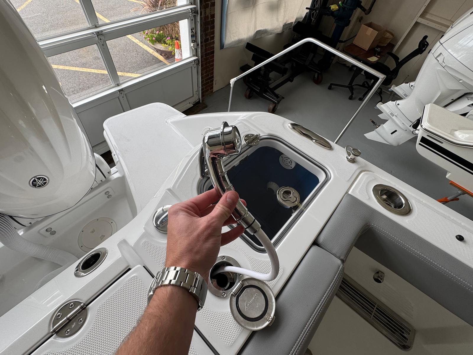 - Fishing Package - storage unit located under the helm seat on the port side, (storage excluded with SK1 option), second live well with pump (replaces aft port cooler box), rod/cup holders at helm seat (2)