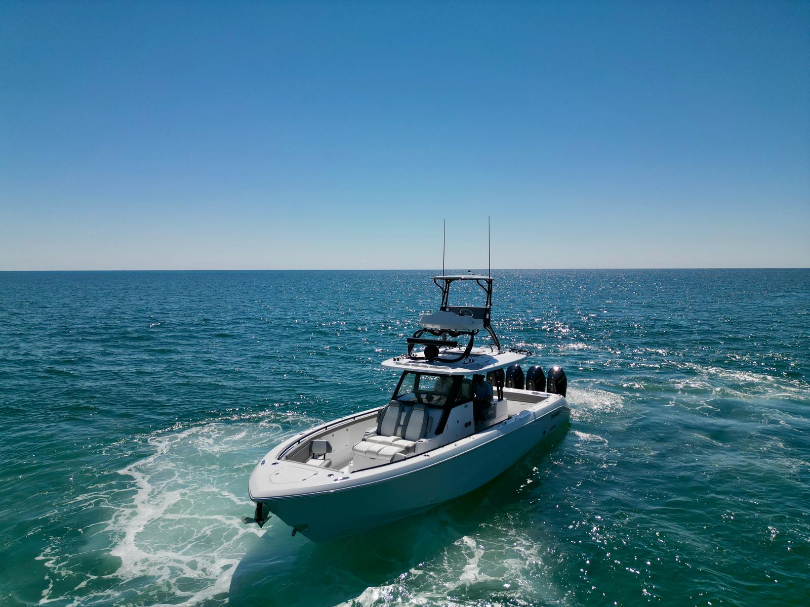 Power and precision are at the heart of the Everglades 395 CC’s performance. Equipped with four Quad Mercury 400 V10 engines, this center console boat boasts a jaw-dropping 1600 horsepower, providing effortless acceleration and top-tier speed for all your adventures. The advanced engine setup features black finishes, autopilot, and joystick controls, allowing for intuitive handling and seamless maneuverability. Whether you’re navigating tight marinas or cruising offshore, the 395 CC’s cutting-edge propulsion system ensures a smooth, responsive ride every time.