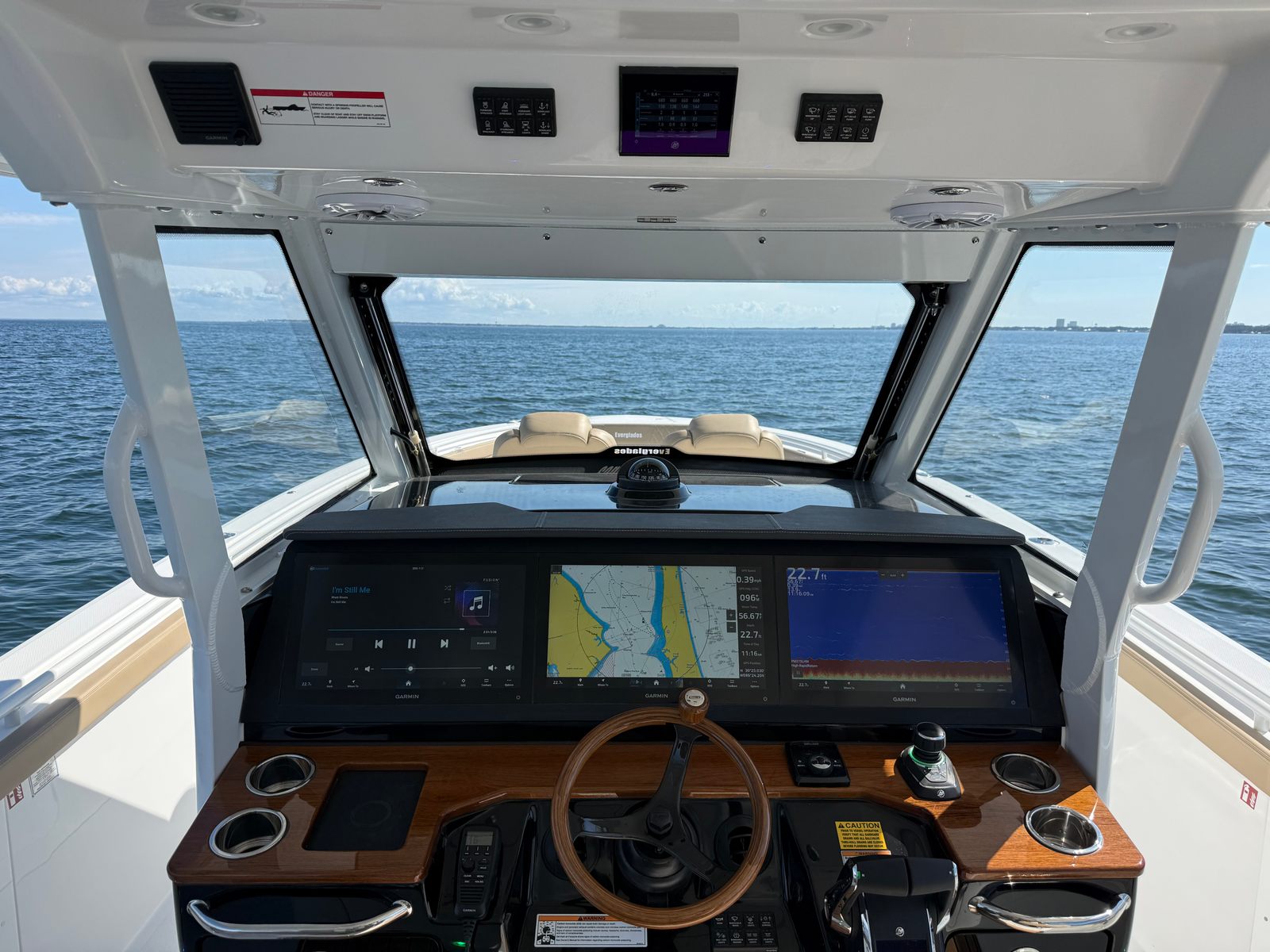 - Upper Station - w/ auto pilot and joystick, sun top, 2 drink holders, folding helm seat bolsters, stainless steel grab rail, glove box, Garmin GHS 11 handset, Garmin 8616 additional screen