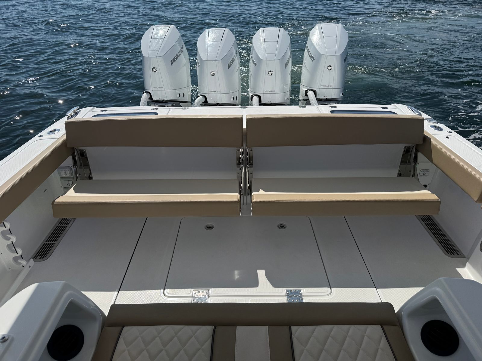 At the heart of the Everglades 395 CC is a powerhouse of performance. Equipped with quad Mercury 425 V10 engines, this center console boat boasts an impressive 1,700 horsepower. The advanced Mercury engines are finished in sleek white, perfectly complementing the boat’s sophisticated aesthetic. With the inclusion of autopilot and joystick controls, both at the main helm and the upper station, navigating tight marinas or docking becomes effortless and precise. The Everglades 395 CC is engineered for speed, agility, and reliability, ensuring you reach your favorite destinations quickly and safely, no matter the conditions.