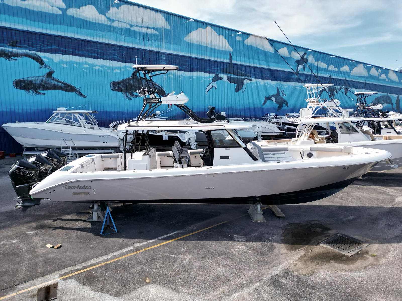 This 2017 Everglades 435CC is a highly optioned, dry-stored, dealer-owned pre-owned boat originally delivered new through Legendary Marine and maintained to a very high standard by its original owner. Since dealer acquisition, the boat has been professionally repowered with 2020 quad Mercury 450R outboards, increasing output from the original 1,400 HP Yamaha F350 package to 1,800 total horsepower.