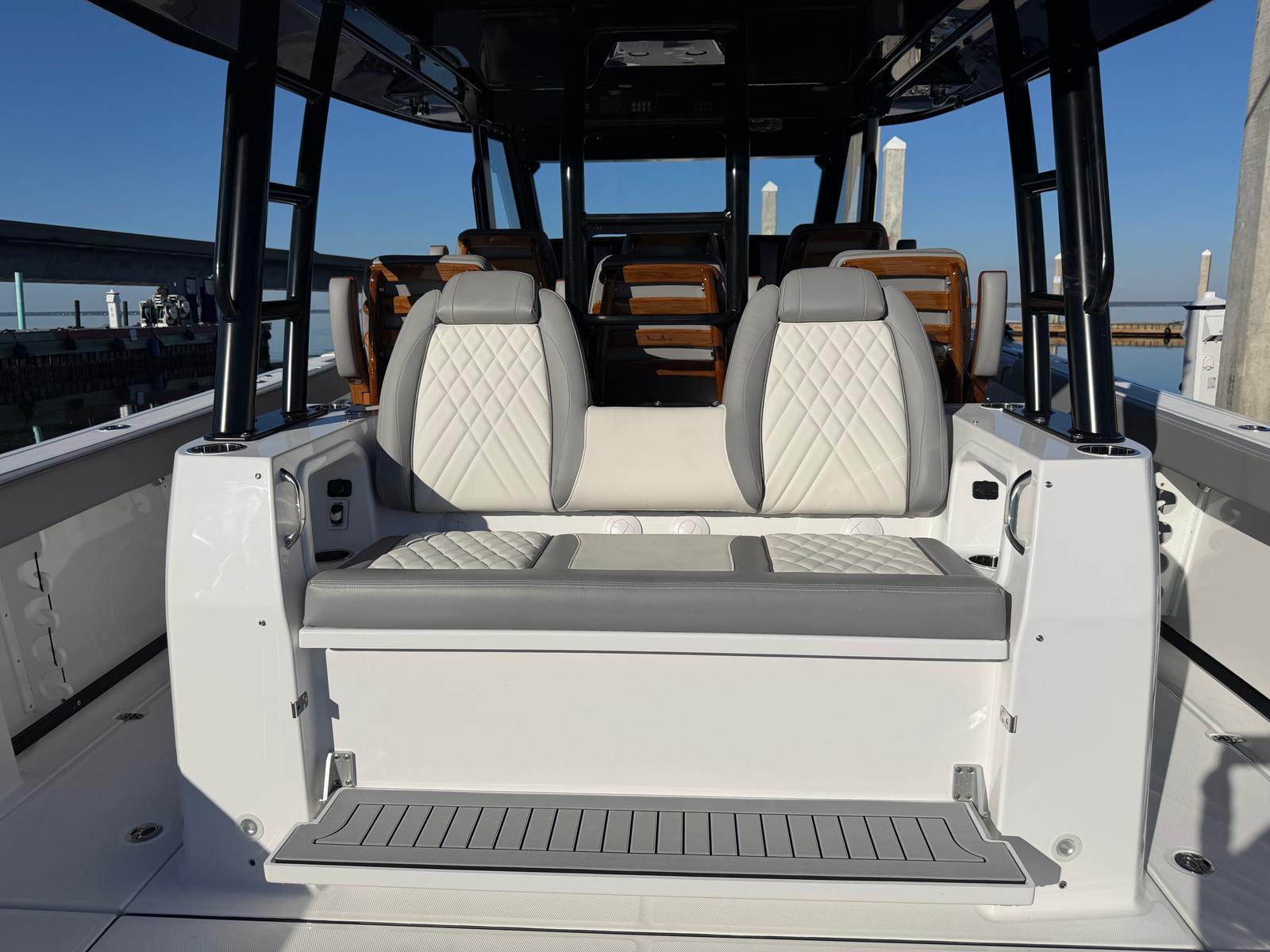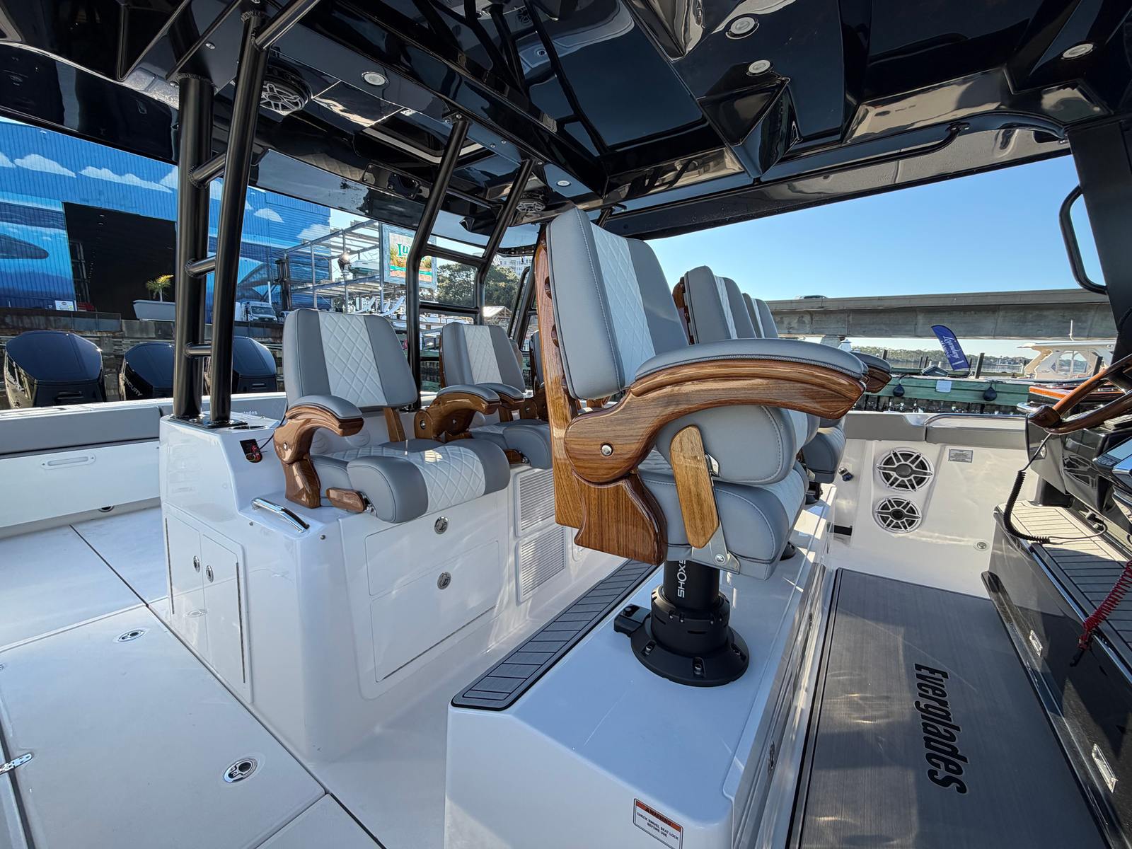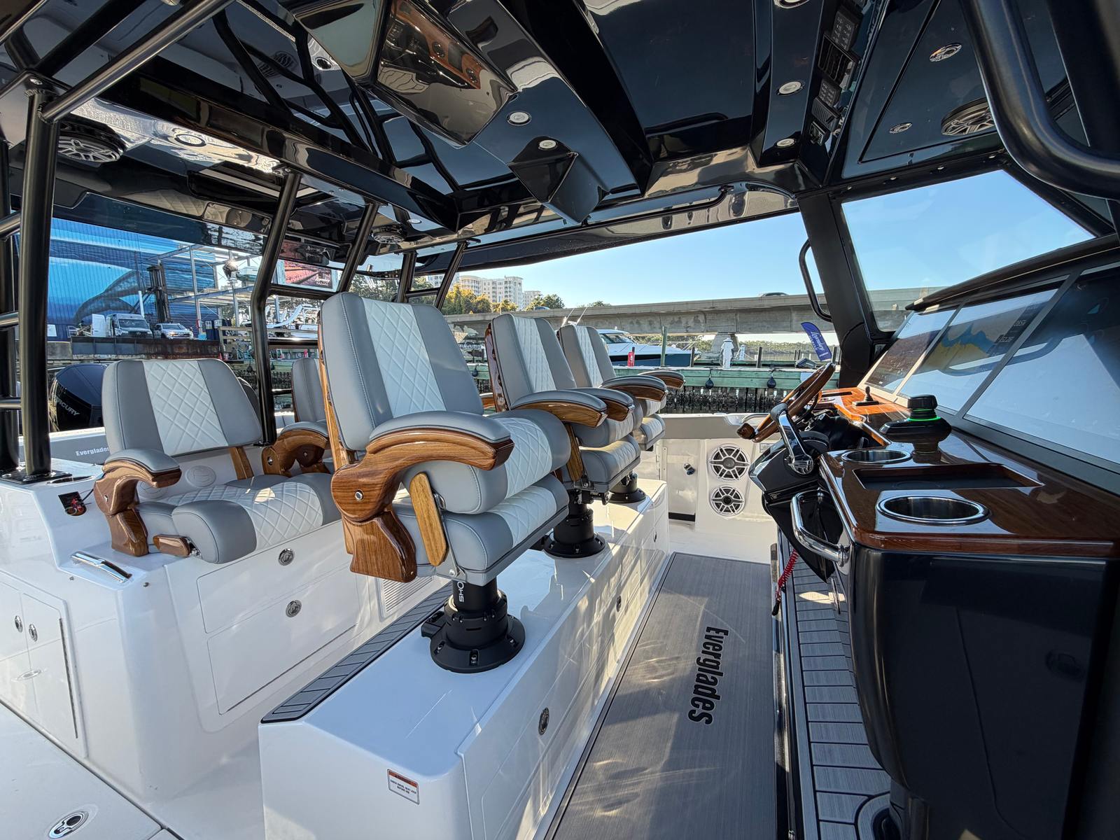The Everglades 455 CC is packed with premium features that elevate your time on the water. The full upper station includes a sun top for shade, two drink holders for convenience, folding helm seat bolsters for comfort, a stainless steel grab rail for safety, and a glove box for secure storage. The helm is equipped with a Garmin GHS 11 handset and an additional Garmin 8616 screen, providing advanced navigation and communication capabilities. The interior cabinet color is Ocean (Teak & Holly), adding a touch of elegance to the cabin space, while the Flint Gray upholstery offers a modern and inviting atmosphere.A comprehensive canvas package is included, featuring covers for the forward console seat, console, helm seat, mezzanine seat, bow seats, second row, and forward rod/cup holders. These covers help protect your investment and keep the boat looking pristine. The upper station, seat, and console are all thoughtfully designed for maximum comfort and utility, ensuring that every outing is enjoyable and stress-free.