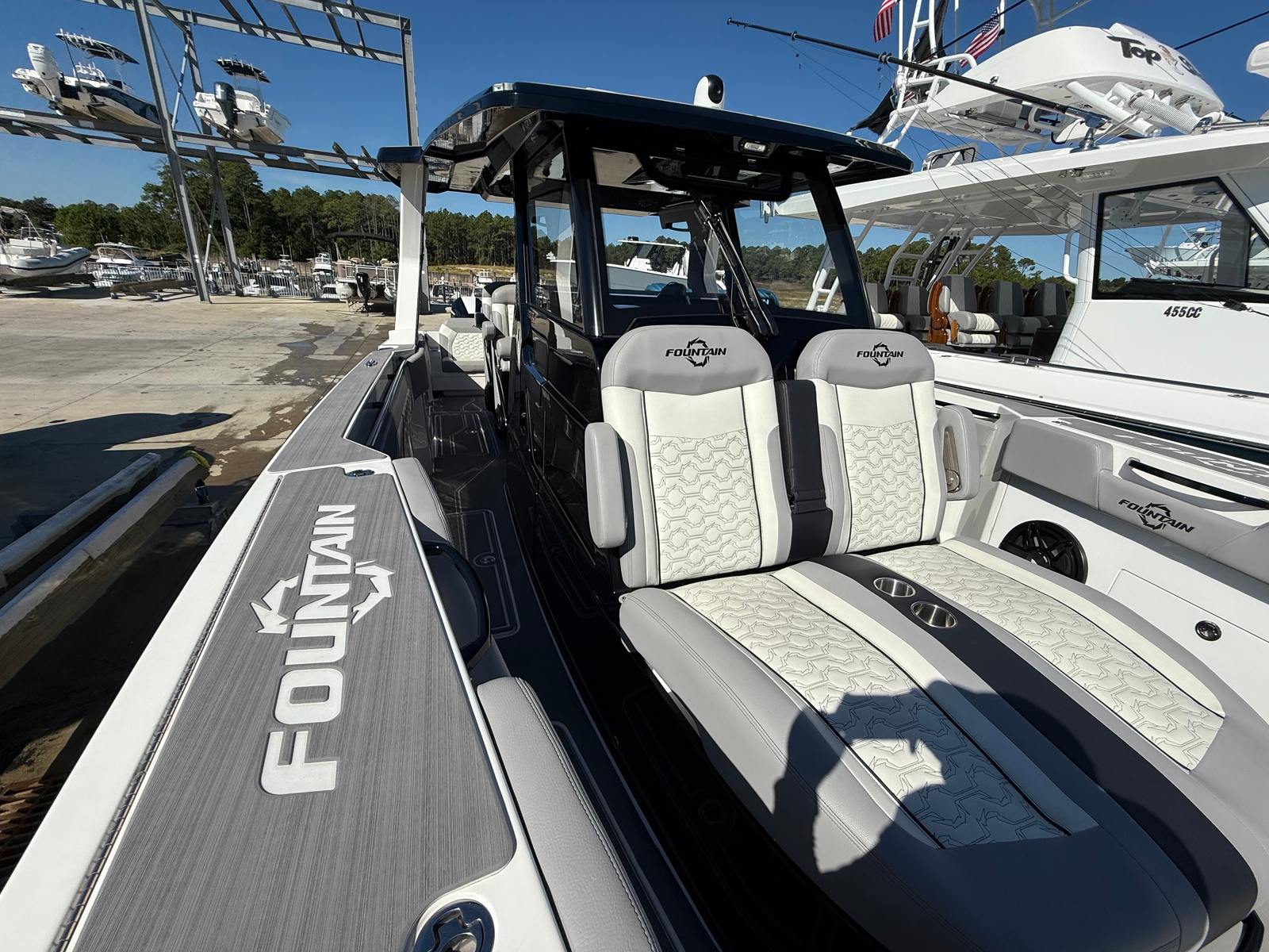 Beyond its recreational appeal, the Fountain 38 SCX Center Console is designed with practicality in mind. The boat’s layout offers convenient storage solutions for gear, supplies, and personal items, keeping the deck uncluttered and organized. Docking is made easier by the vessel’s responsive handling and maneuverability, allowing you to navigate tight spaces with confidence. The efficient hull design contributes to fuel savings, making longer trips more economical and environmentally friendly. Whether you’re planning a day trip or an extended voyage, this Fountain boat for sale is equipped to handle the demands of active boaters who appreciate both convenience and performance.