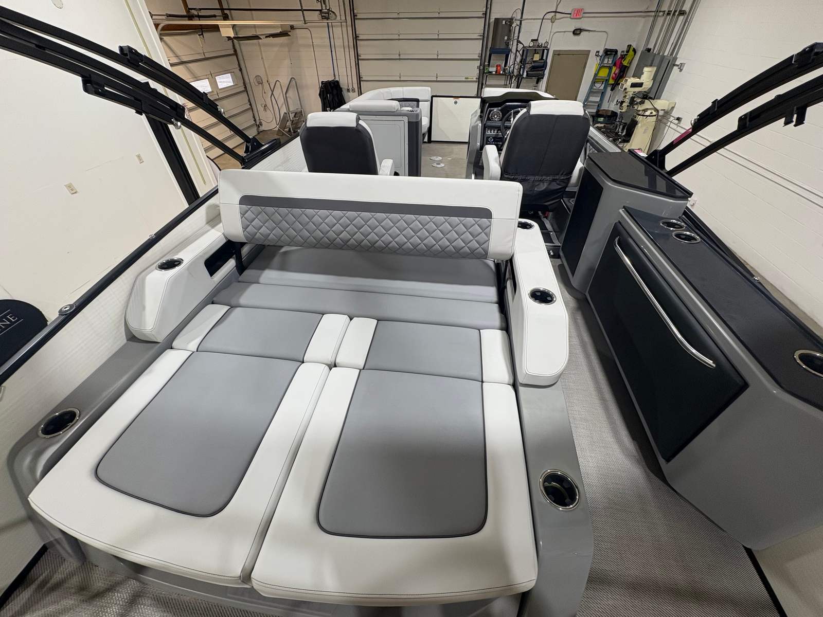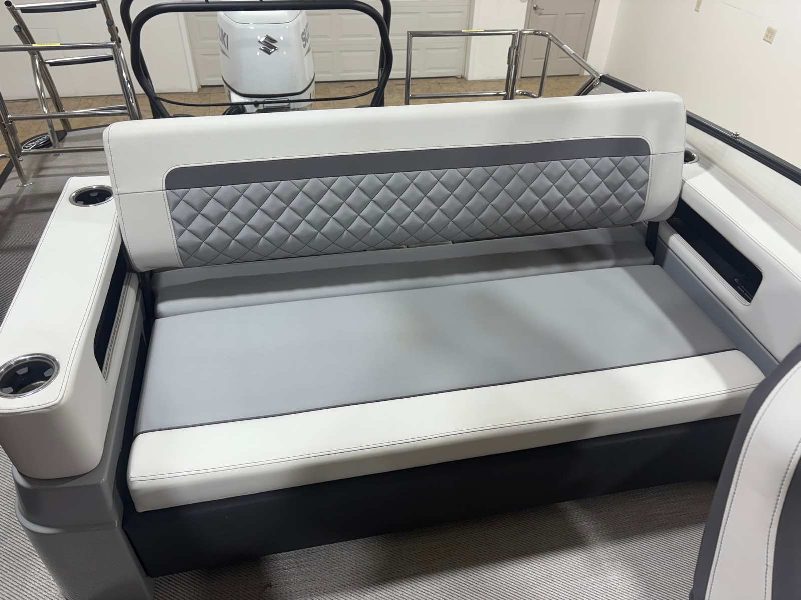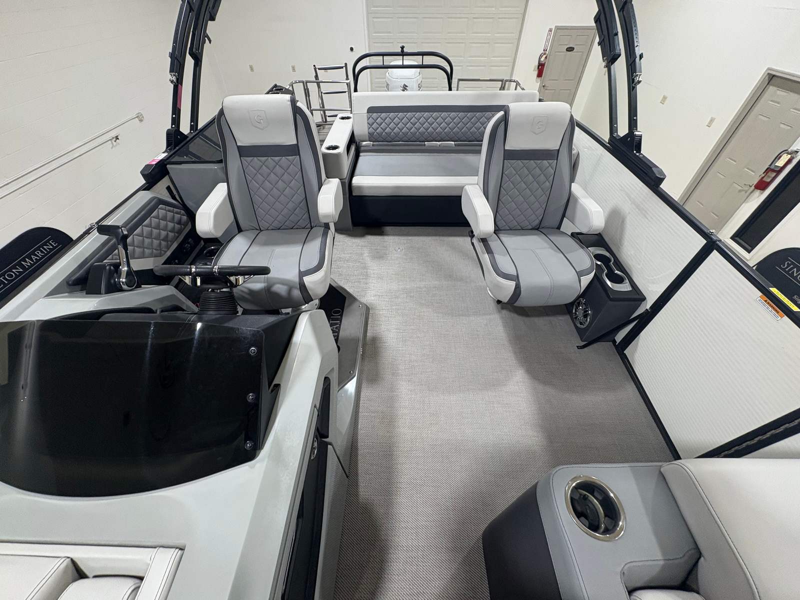 The Godfrey Aqua Patio 235 Sflc comes equipped with a host of special features that set it apart from other pontoon boats for sale. Enjoy the convenience of a FULL MOORING COVER, which helps protect your investment and keeps your boat looking pristine. The POWER BIMINI TOP offers effortless shade and shelter, allowing you to relax in comfort no matter the weather. The TRANSOM RAIL SYSTEM adds safety and versatility, while DOCKING LIGHTS make evening arrivals and departures a breeze.For those who love water activities, the FOLDING SWIM LADDER and SKI TOW BAR make it easy to dive in or enjoy exhilarating water sports. The UNDERWATER LIGHTS and RGB UNDERDECK LIGHTS create a captivating ambiance for nighttime cruises, while the RGB INTERIOR LIGHTING lets you set the mood for any occasion. The stainless steel prop not only boosts performance but also adds a touch of sophistication to the boat’s overall design.