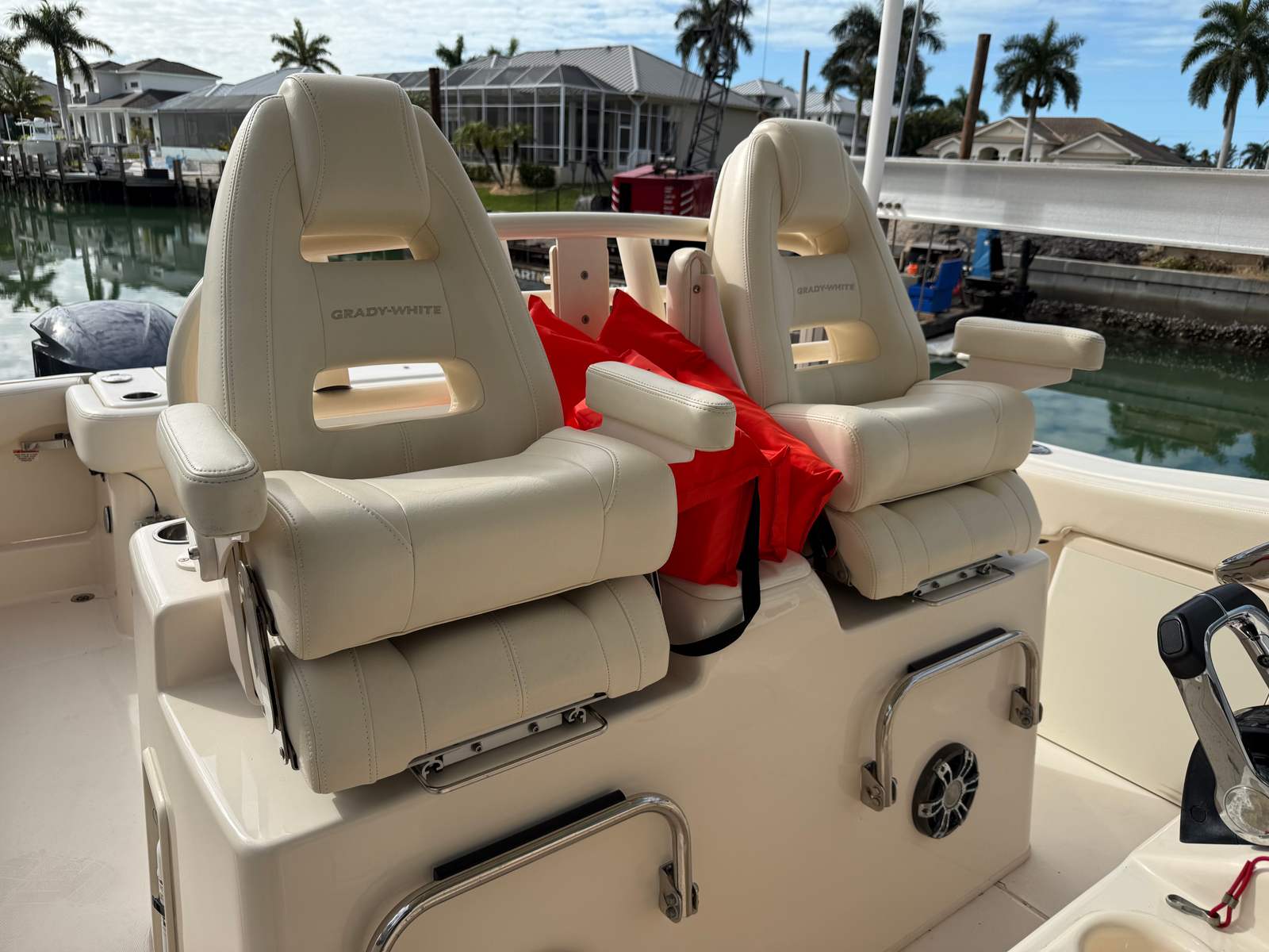 At the helm, the boat is fully equipped with twin Garmin 16-inch navigation displays with sonar readout, offering expansive, easy-to-view charting and fish-finding capabilities. A Garmin autopilot is also installed, making long runs more comfortable and precise. For entertainment, the Fusion stereo system with bow-to-stern speakers delivers clear, powerful sound throughout the boat, perfect for both cruising and relaxing at anchor.
