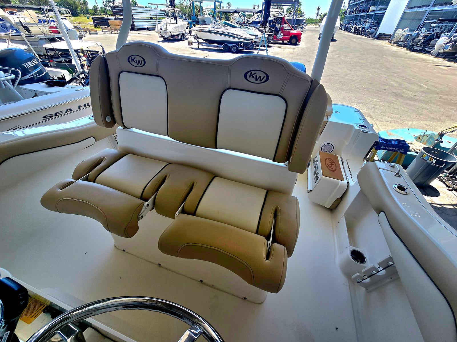 This very clean 2020 KeyWest 263 FS has many amenities such as side step dive door with an integrated ladder, forward seating with removable backrest in a full width rear bench seat, very large dual live wells located in the stern. Also has dual large in floor fish boxes. This is powered by twin Yamaha 200s with about 110 hours.