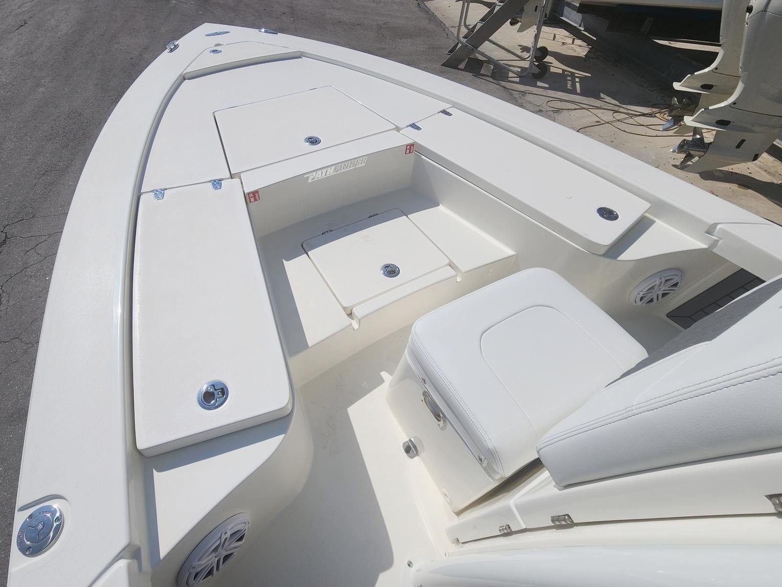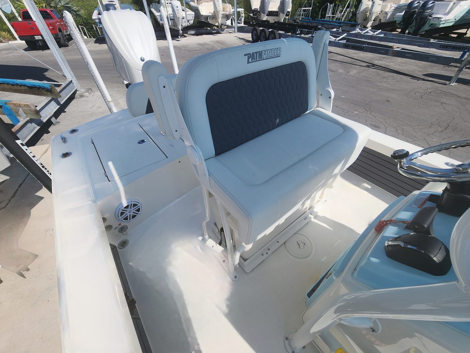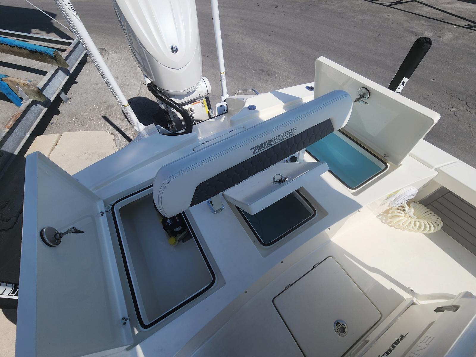 The Pathfinder 2300 HPS is as practical as it is fun. Its manageable 23.5-foot length makes it easy to store in most marinas or on a trailer, while the efficient Yamaha F300XSB2 engine helps you make the most of every gallon of fuel. The digital electric steering and Helm Master EX system simplify docking and close-quarters maneuvering, reducing stress and making every trip more enjoyable. The jackplate and trim tabs allow you to adapt to different water depths and conditions, expanding your range of exploration. Whether you are heading out for a quick afternoon cruise or planning a full day on the water, this Pathfinder boat for sale is equipped to handle it all with ease.