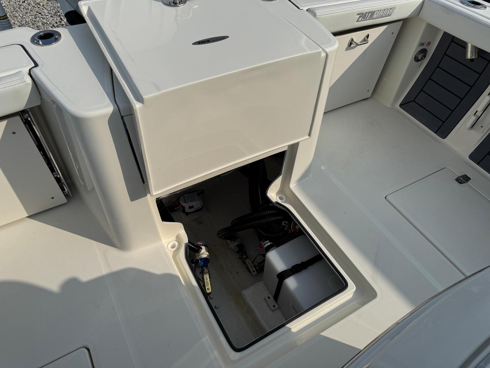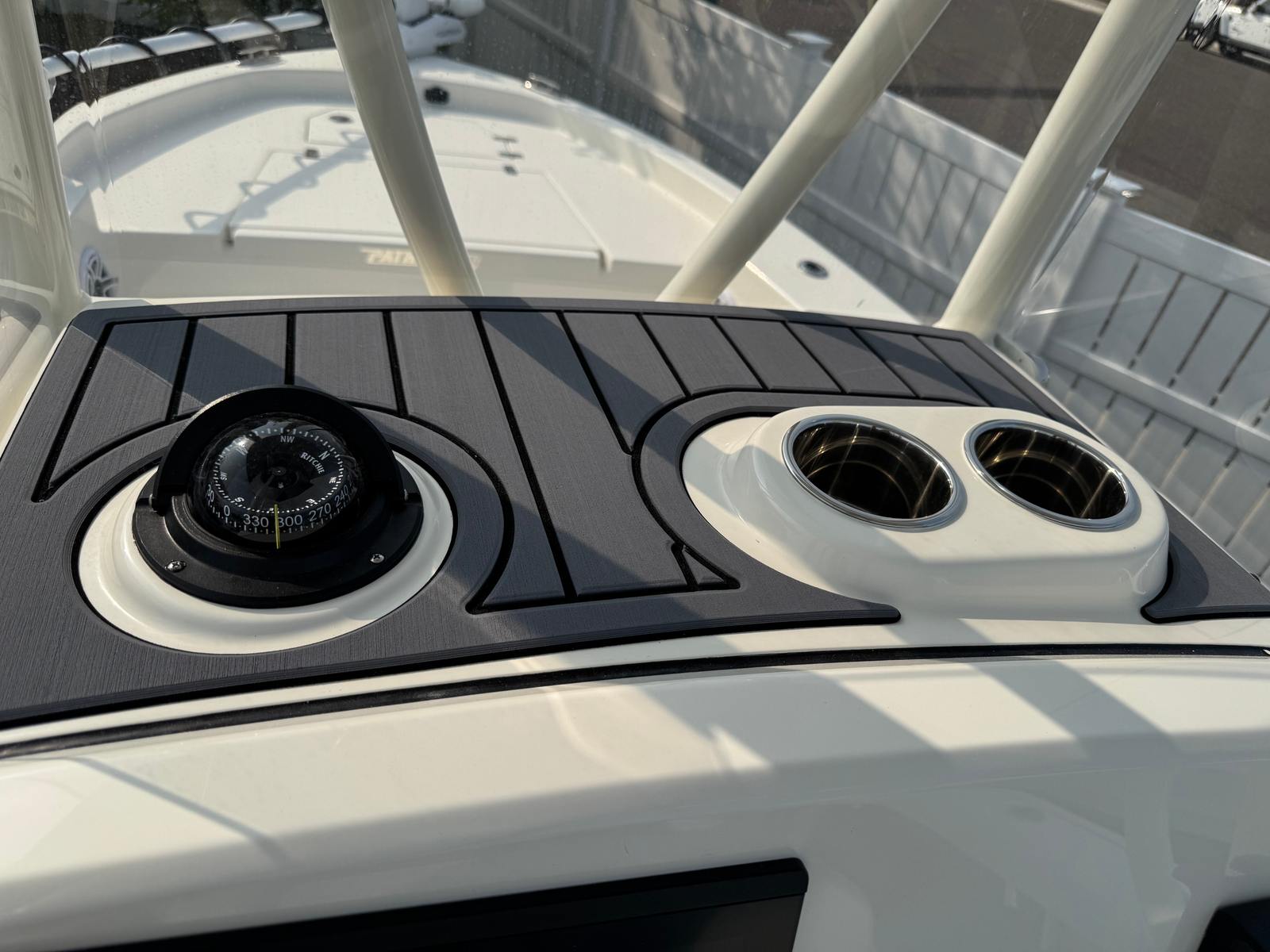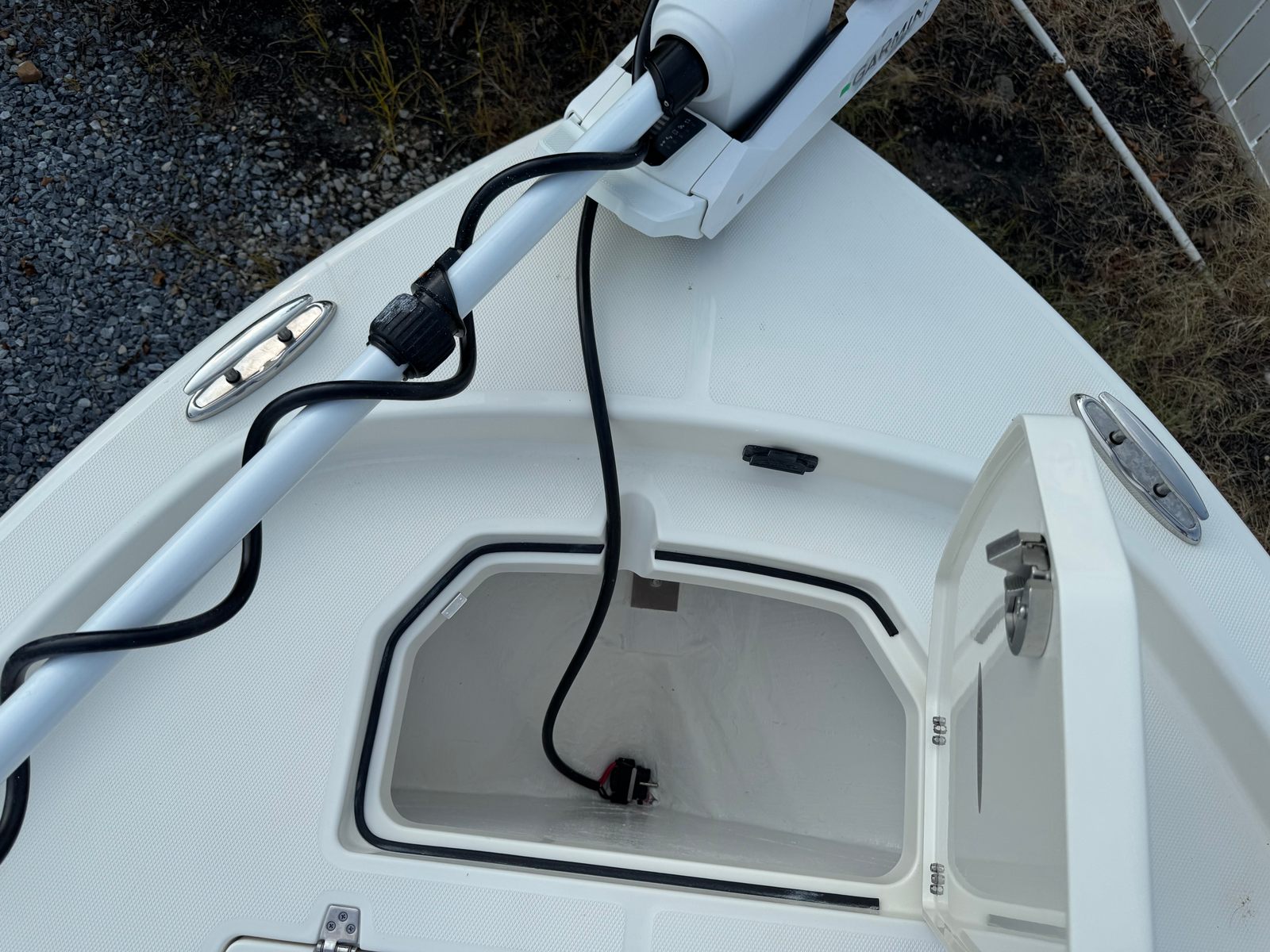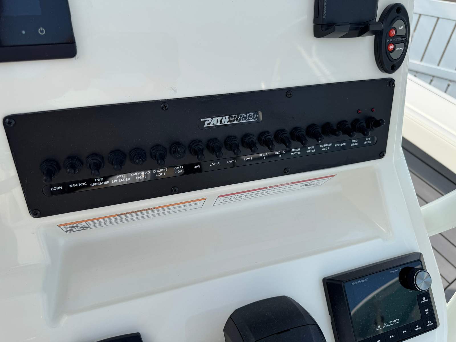The 2026 Pathfinder 2400 Open is loaded with special features that elevate your boating experience. The fiberglass hard-top offers excellent protection from the sun and elements, creating a comfortable environment for all on board. The electronics package includes a VHF 215 radio installed in the hard top, ensuring reliable communication and safety during your adventures. For anglers, the boat is equipped with forward and aft fish box pump-outs with macerators, making it easy to store and manage your catch. The additional cushion options, including an aft seat set, provide extra comfort for passengers, while the 4-bank battery charger ensures your electronics and accessories are always powered up. The trim tab indicator allows for precise adjustments, enhancing handling and ride comfort. The white 10-foot Power Pole on the starboard side offers superior anchoring capability, making it easy to hold your position in shallow waters. The powder coating package, including the T-top, adds durability and a sleek, cohesive look to the boat.