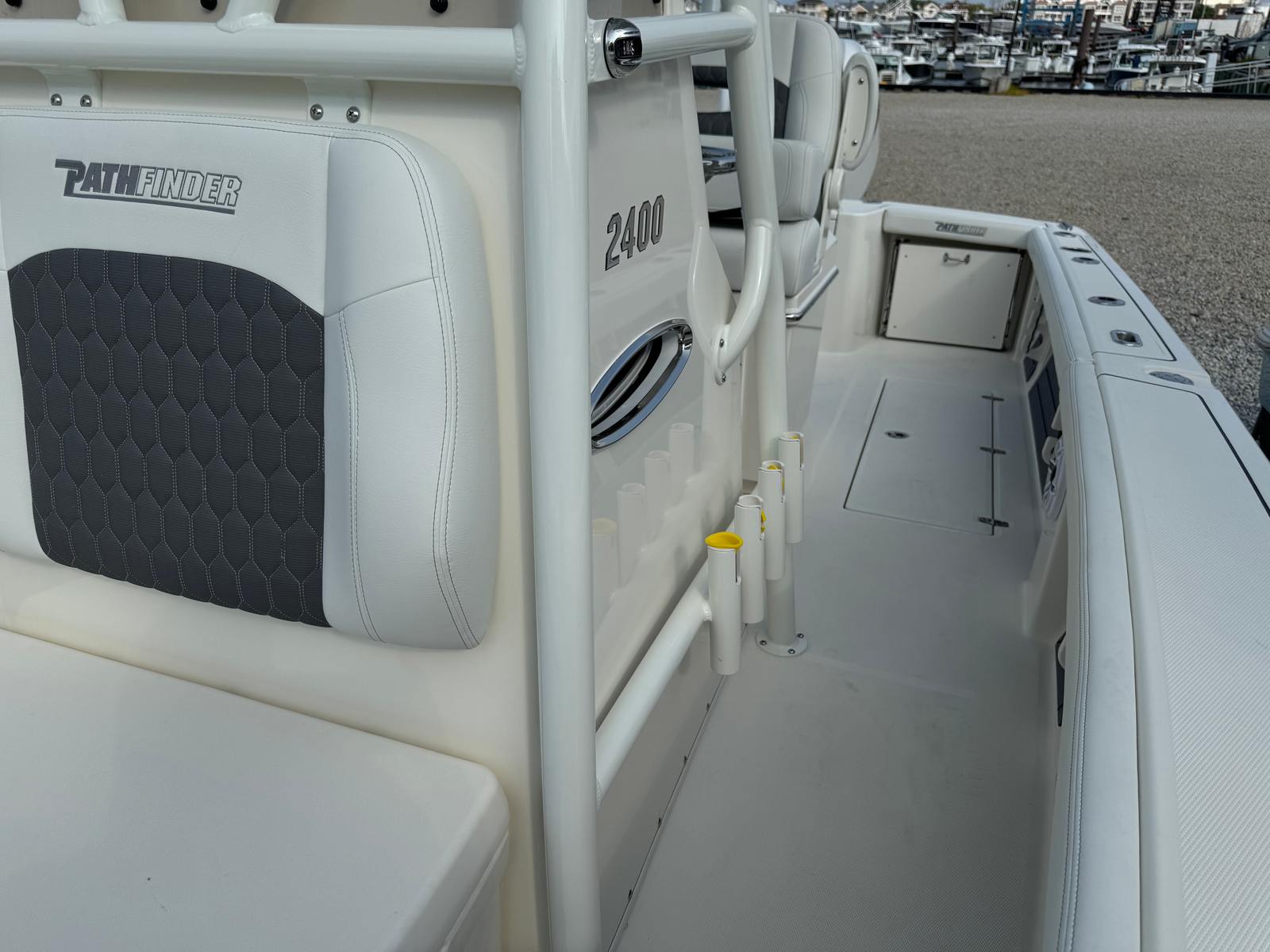 The 2026 Pathfinder 2400 Open is a 24.33-foot center console boat that exemplifies modern marine engineering and craftsmanship. Its spacious layout and thoughtful design make it an ideal vessel for a wide range of activities, from serious fishing expeditions to leisurely outings with friends and family. The boat’s solid pure white finish, complemented by a powder coating package in white, gives it a sophisticated and timeless appearance that turns heads at the dock and on the water. As a new model, this Pathfinder boat for sale offers the latest advancements in comfort, safety, and convenience, ensuring you enjoy every moment on board.