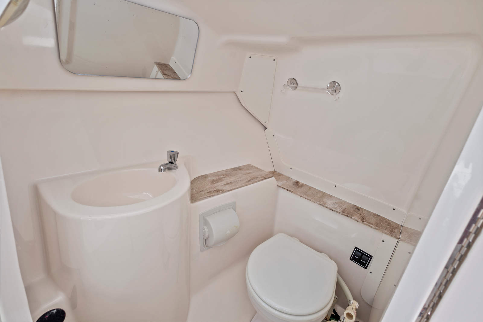 One of the defining features of the 265 DC is its well-appointed cabin and enclosed head. On the port side, you’ll find a spacious head compartment with a marine toilet, sink, and vanity—ventilated, easy to access, and a huge plus on long days aboard. Opposite, there’s a portside console cabin/storage space that can be used for gear, dry storage, or even a quick escape from the sun. Combined, these dual consoles provide ample storage and the kind of convenience rarely found in boats of this size.