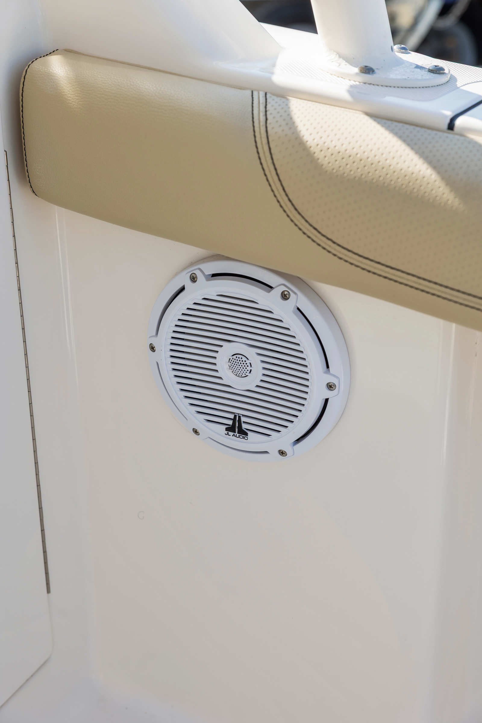 The cockpit is large and open, designed for fishing, lounging, or entertaining. The port-side companion seating converts to a sun lounger or bench seat, and the transom fold-down seat tucks away cleanly when it’s time to fish. An integrated livewell, rod holders, and insulated fish boxes add to the utility, while the premium JL Audio sound system and freshwater sink keep guests comfortable and entertained.