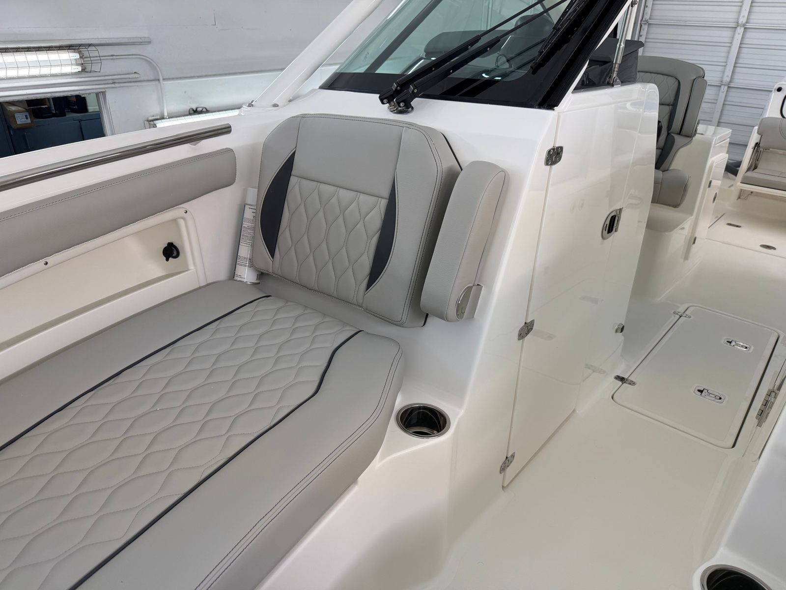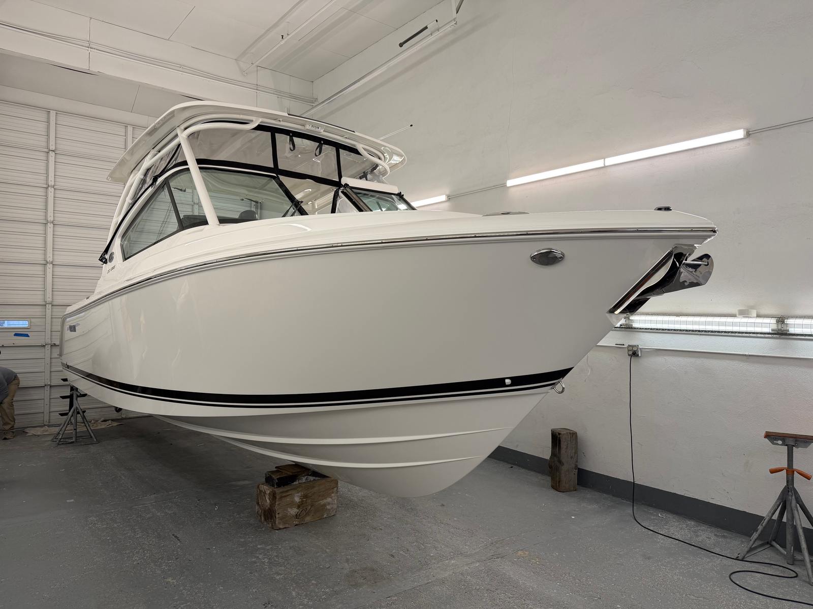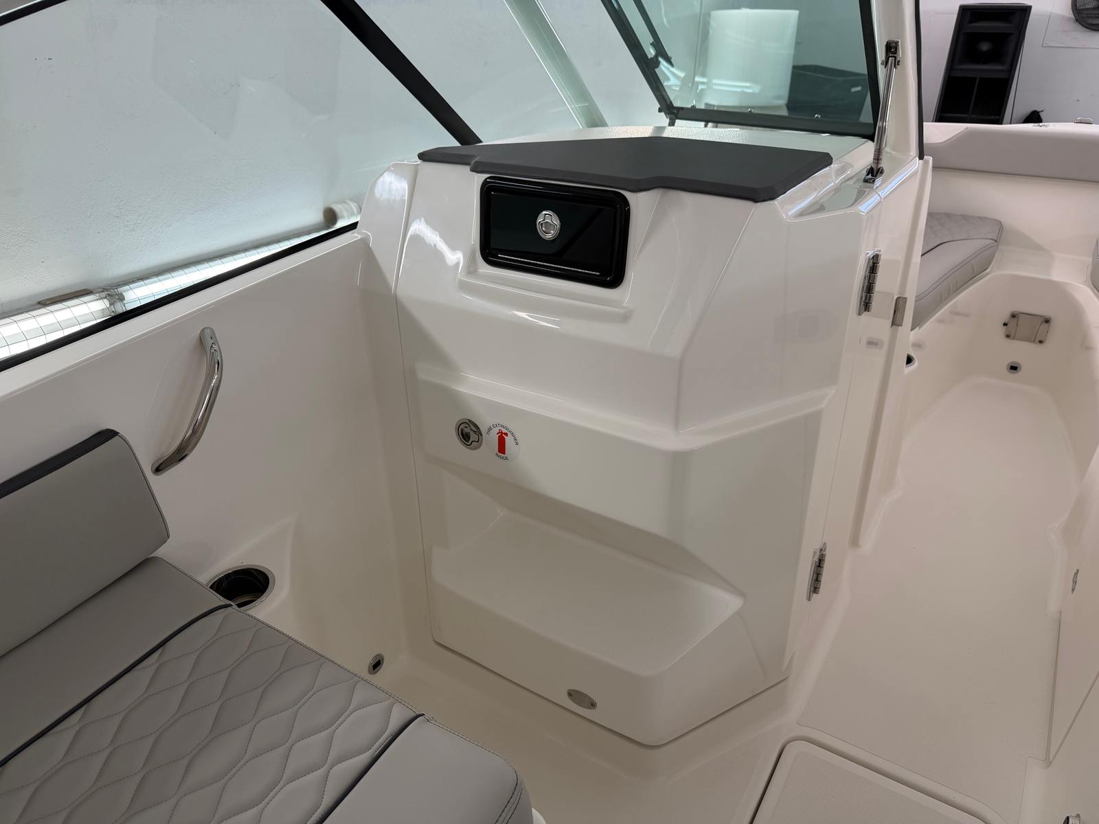 The 2026 Pursuit DC 266 dual console boat is a testament to Pursuit’s commitment to quality and innovation. Measuring an impressive 27.33 feet in length, this vessel offers ample space for relaxation, entertainment, and adventure. The fresh white hull, accented by a bold black bootstripe, exudes modern elegance, while the carbon helm adds a touch of sophistication to the captain’s domain. Every detail of the DC 266 is crafted to provide a seamless blend of style and functionality, making it an ideal choice for boaters who appreciate both aesthetics and performance.