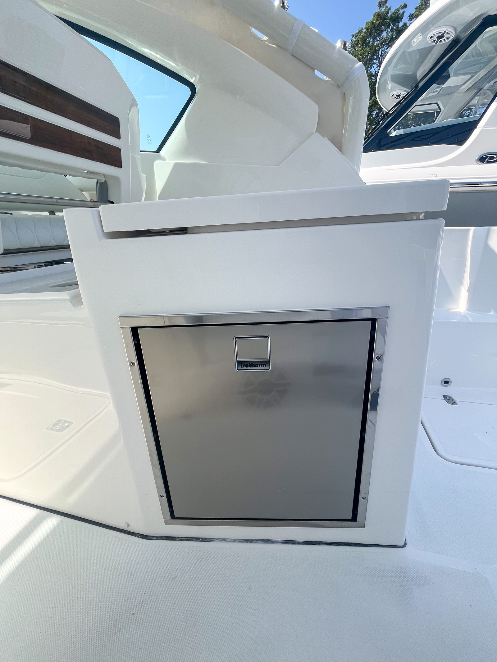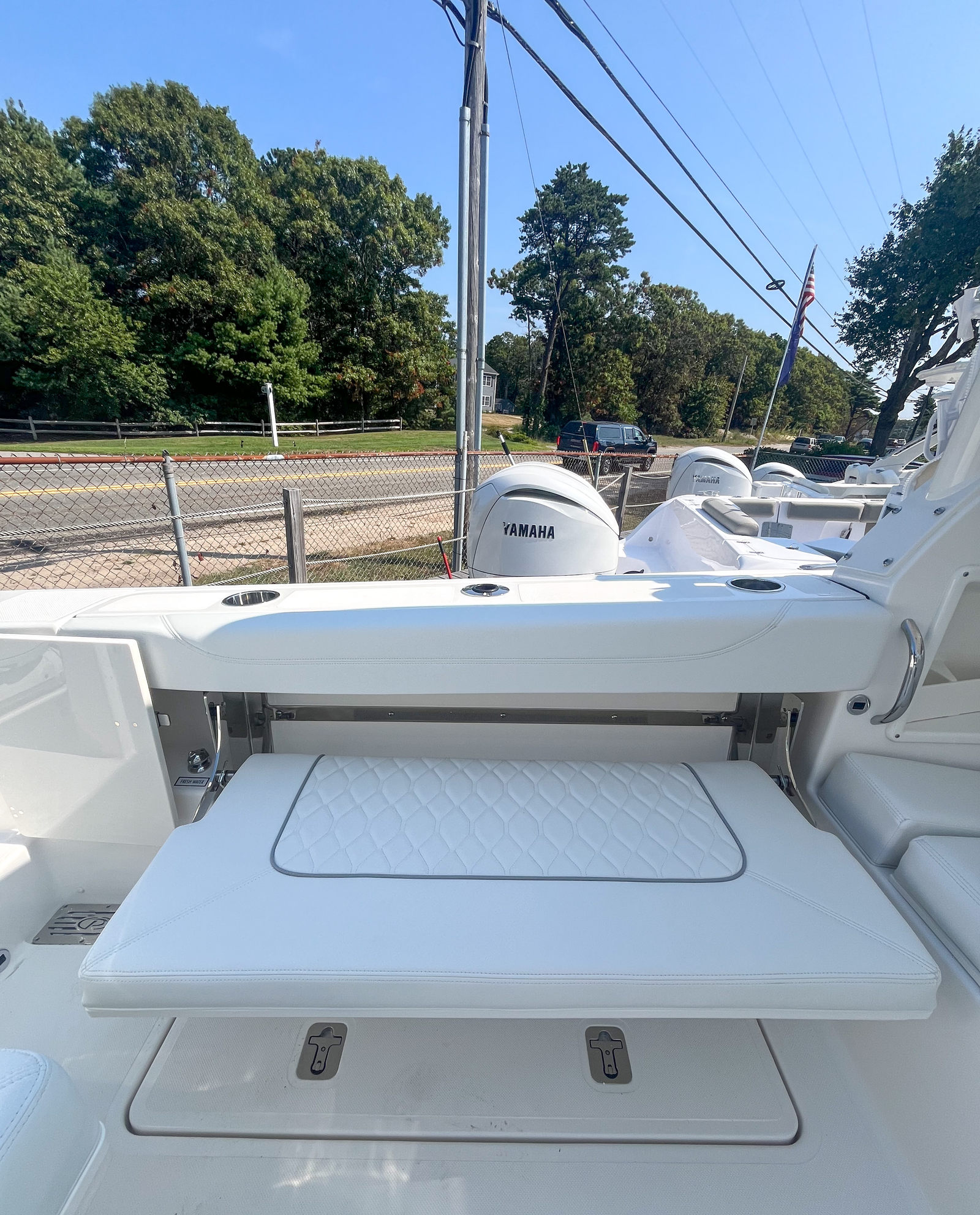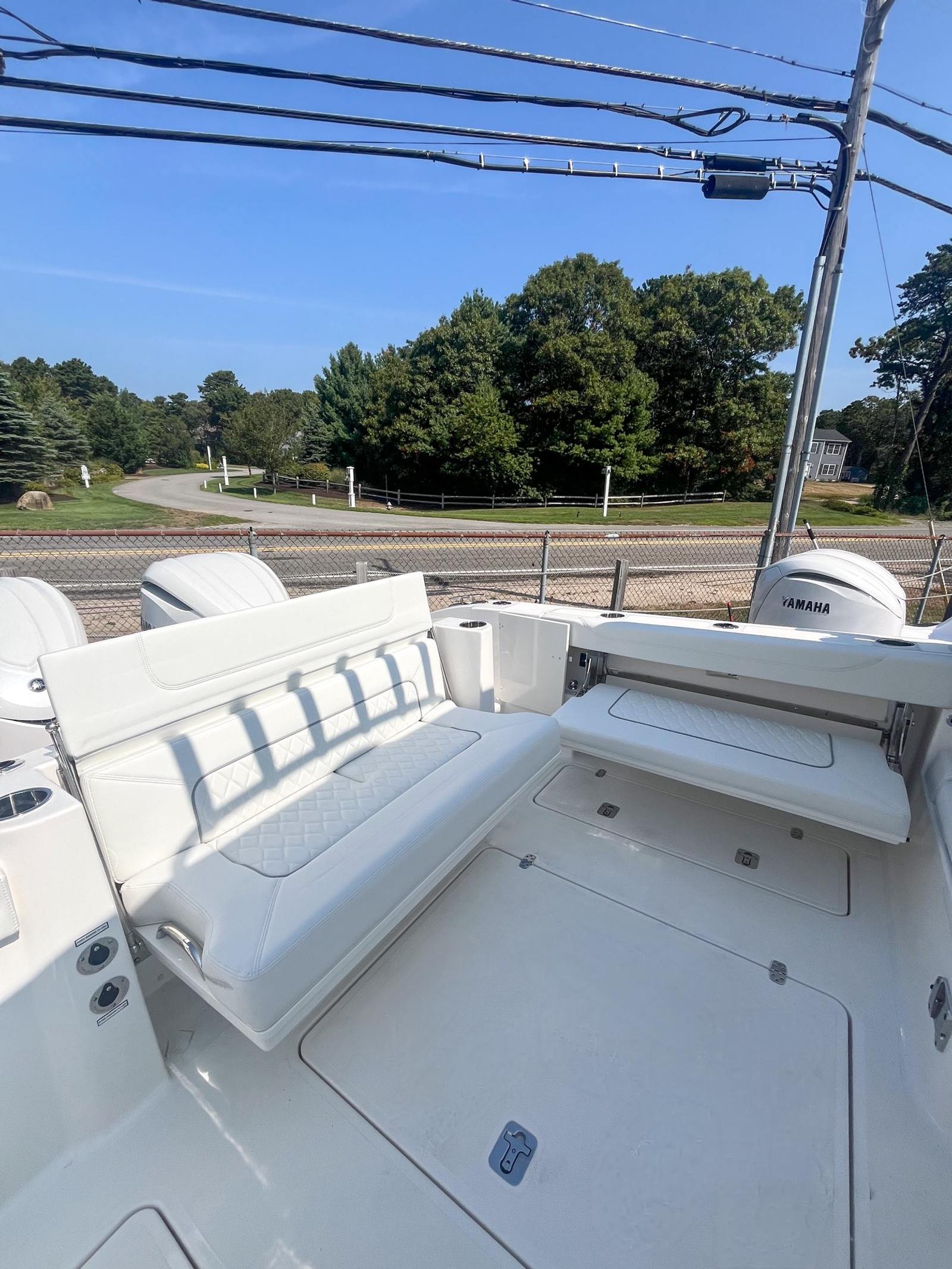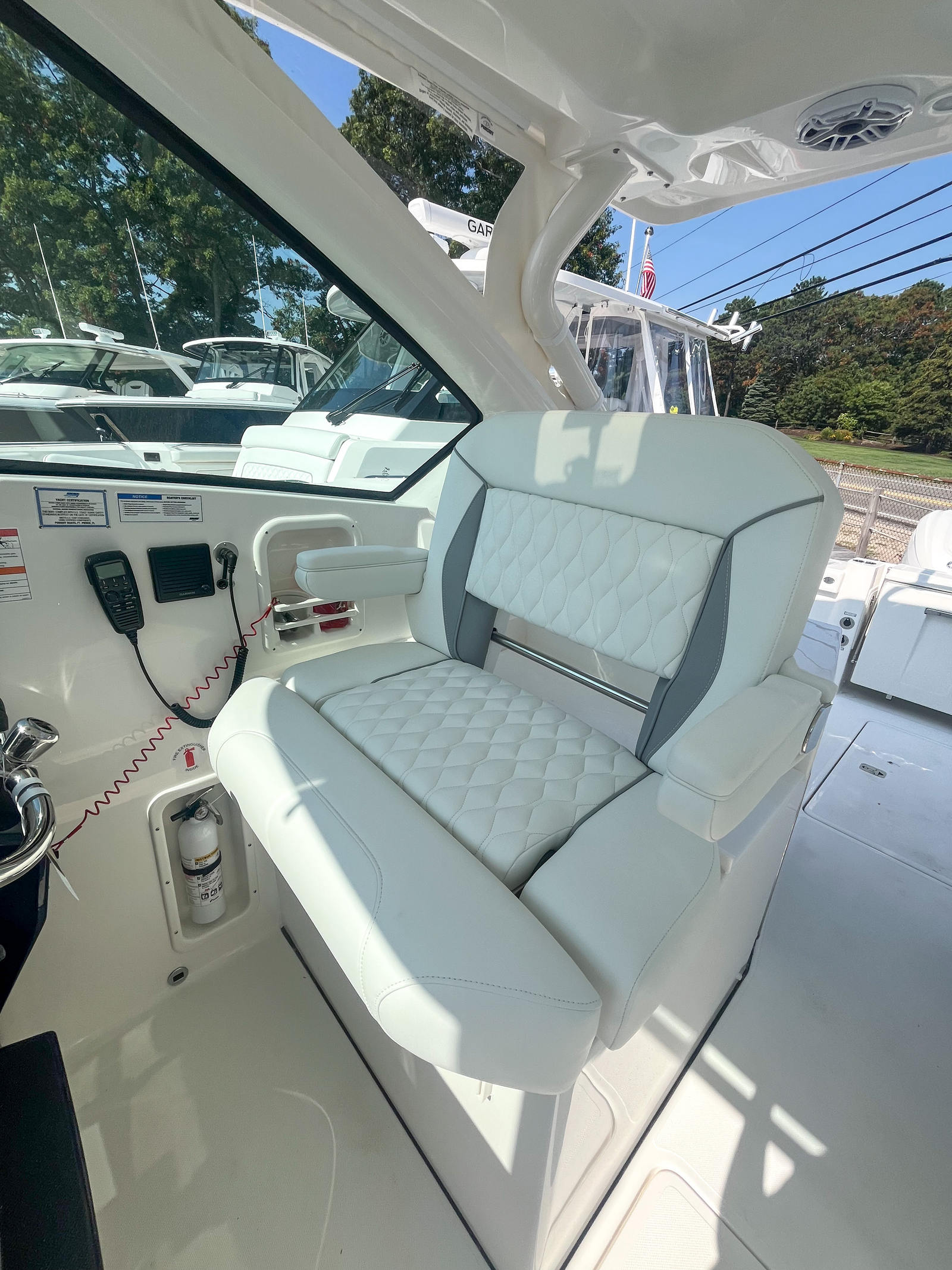 This Pursuit boat for sale is loaded with premium features that enhance both functionality and enjoyment. The Multifunction Display Interface puts navigation and system controls at your fingertips, while the Flag Blue hull and Platinum bootstripe add a touch of elegance to its exterior profile. The helm, also finished in Flag Blue, is ergonomically designed for maximum comfort and visibility. Inside, the Tranquil Sea interior and upgraded white/gray upholstery create a luxurious atmosphere, perfect for relaxing after a day on the water. The Bridge Deck Teak Table with storage offers a convenient space for dining or socializing, while the custom-tuned 8-channel DSP amp and premium M6 Sport speakers with full-spectrum backlighting deliver an immersive audio experience. The Sirius receiver, complete with a three-month subscription, ensures you have access to your favorite music and entertainment while cruising. For added safety and convenience, the ACR RCL-100 LED spotlight with remote control at the helm provides powerful illumination for nighttime navigation. The underwater LED lighting (three Quattro Spectrum units) enhances the boat’s visual appeal and creates a vibrant ambiance for evening gatherings.