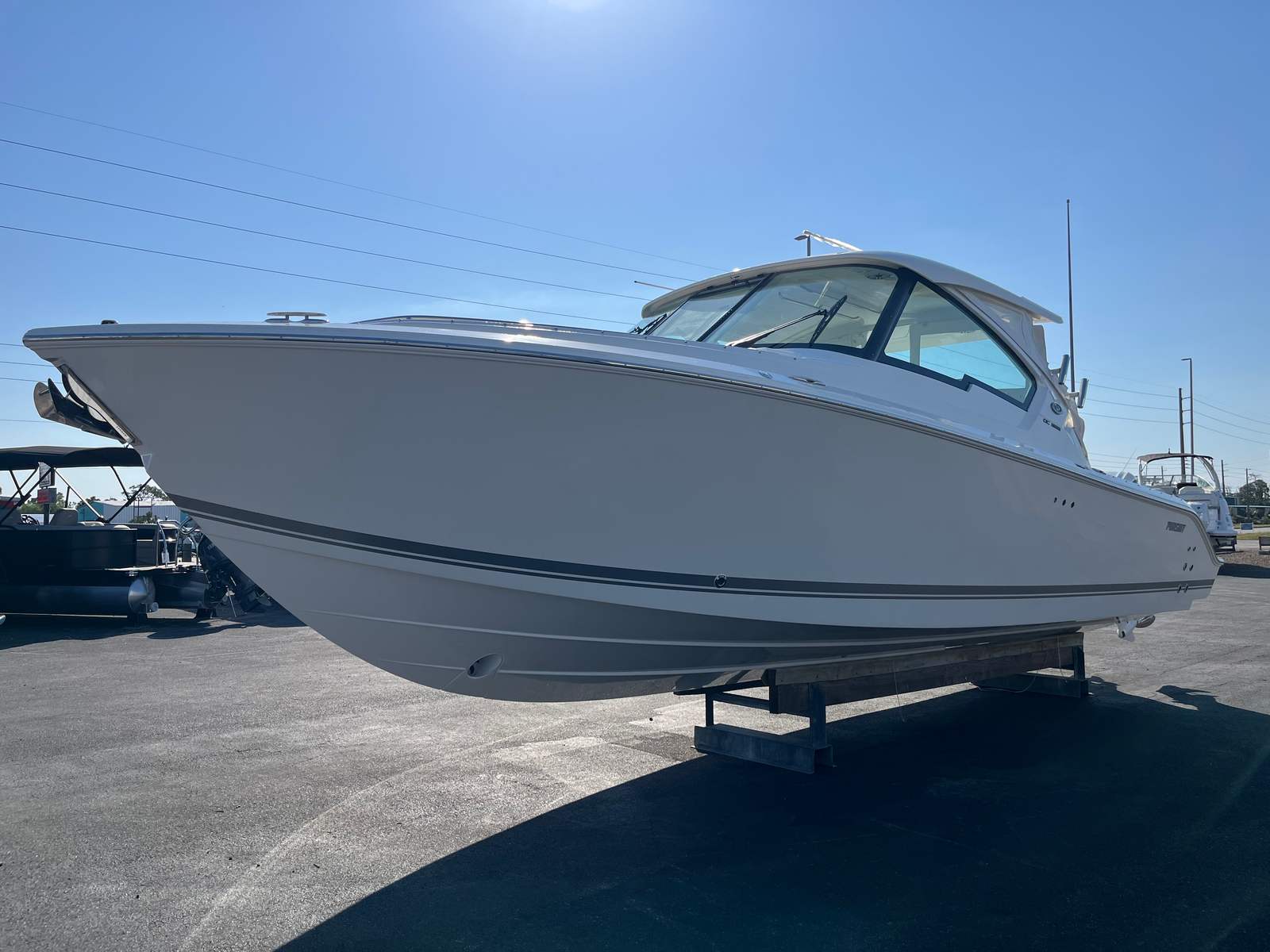 The 2026 Pursuit DC 326 is a 34.5-foot dual console boat that exemplifies modern design and engineering excellence. With its sleek lines and sophisticated profile, this Pursuit boat for sale is sure to turn heads at the marina and on open water. The hull is finished in a fresh white color, complemented by a platinum bootstripe with platinum accent, giving the boat a refined and contemporary appearance. The upgraded upholstery features cockpit seating in white with gray accents, while the interior is adorned in the tranquil sea color scheme, creating a relaxing and inviting atmosphere for you and your guests.