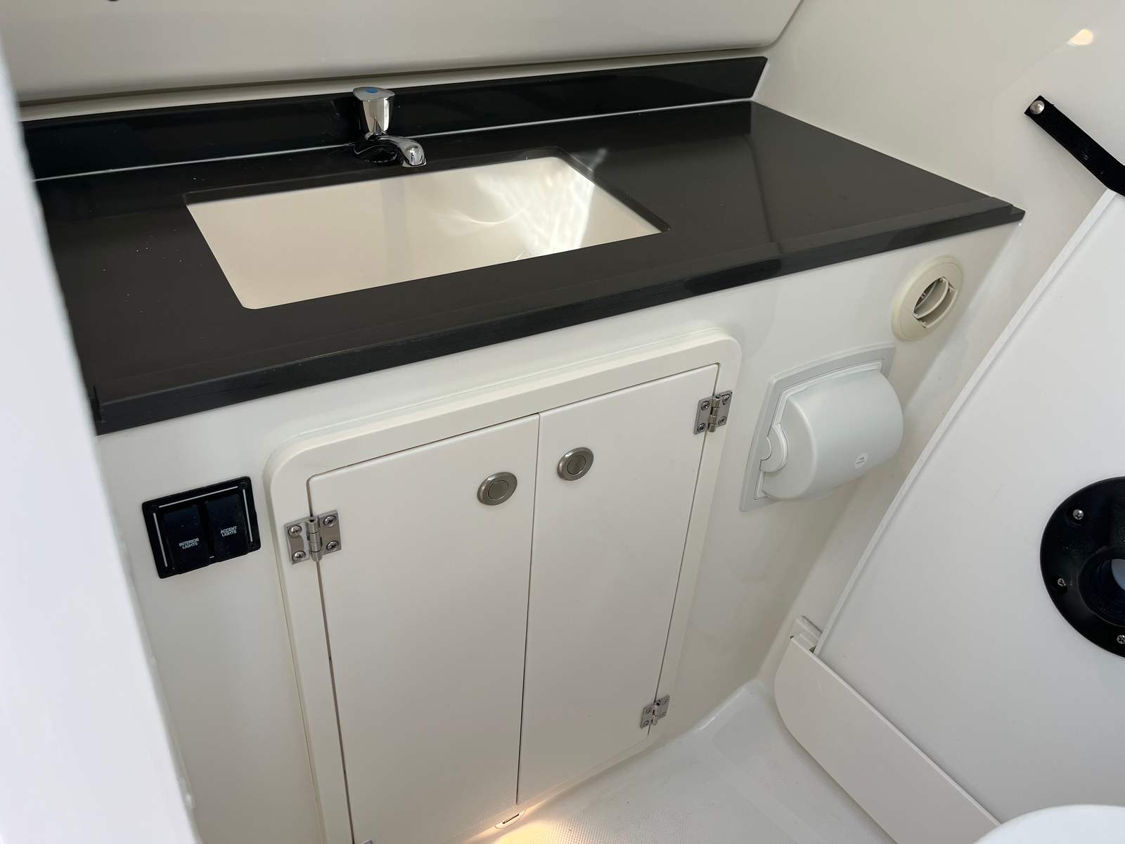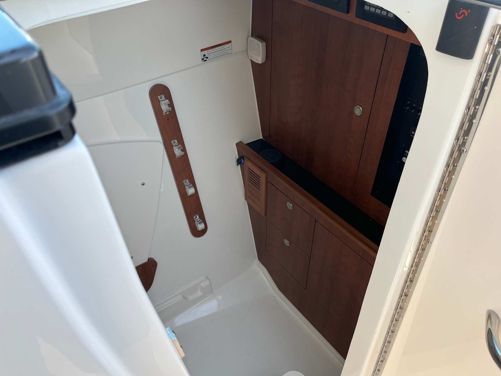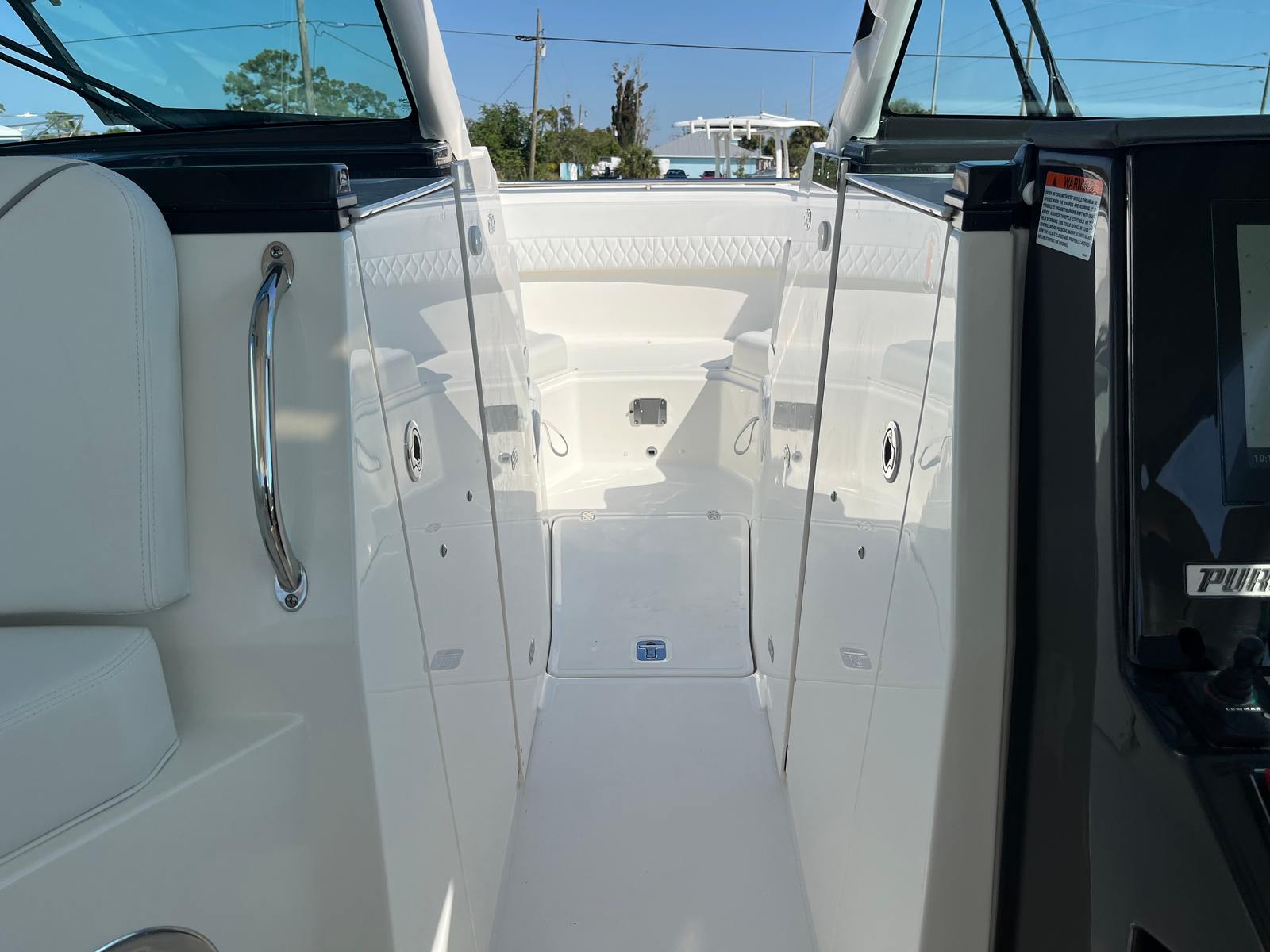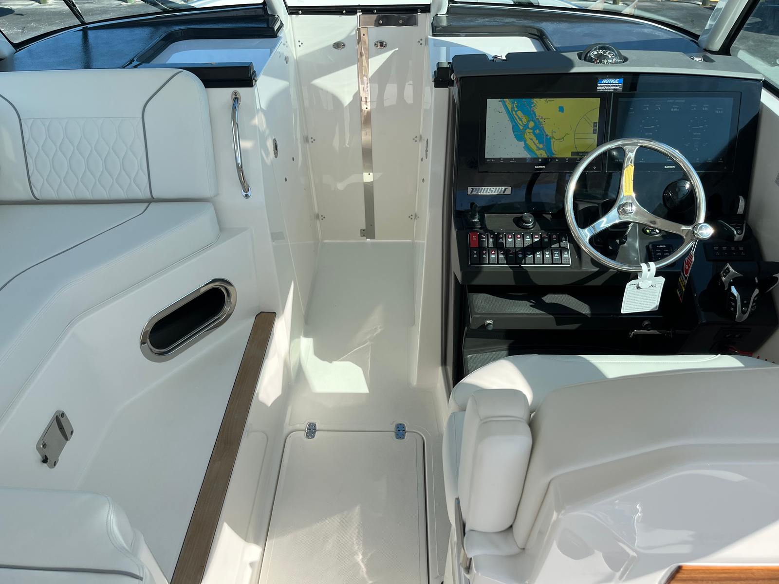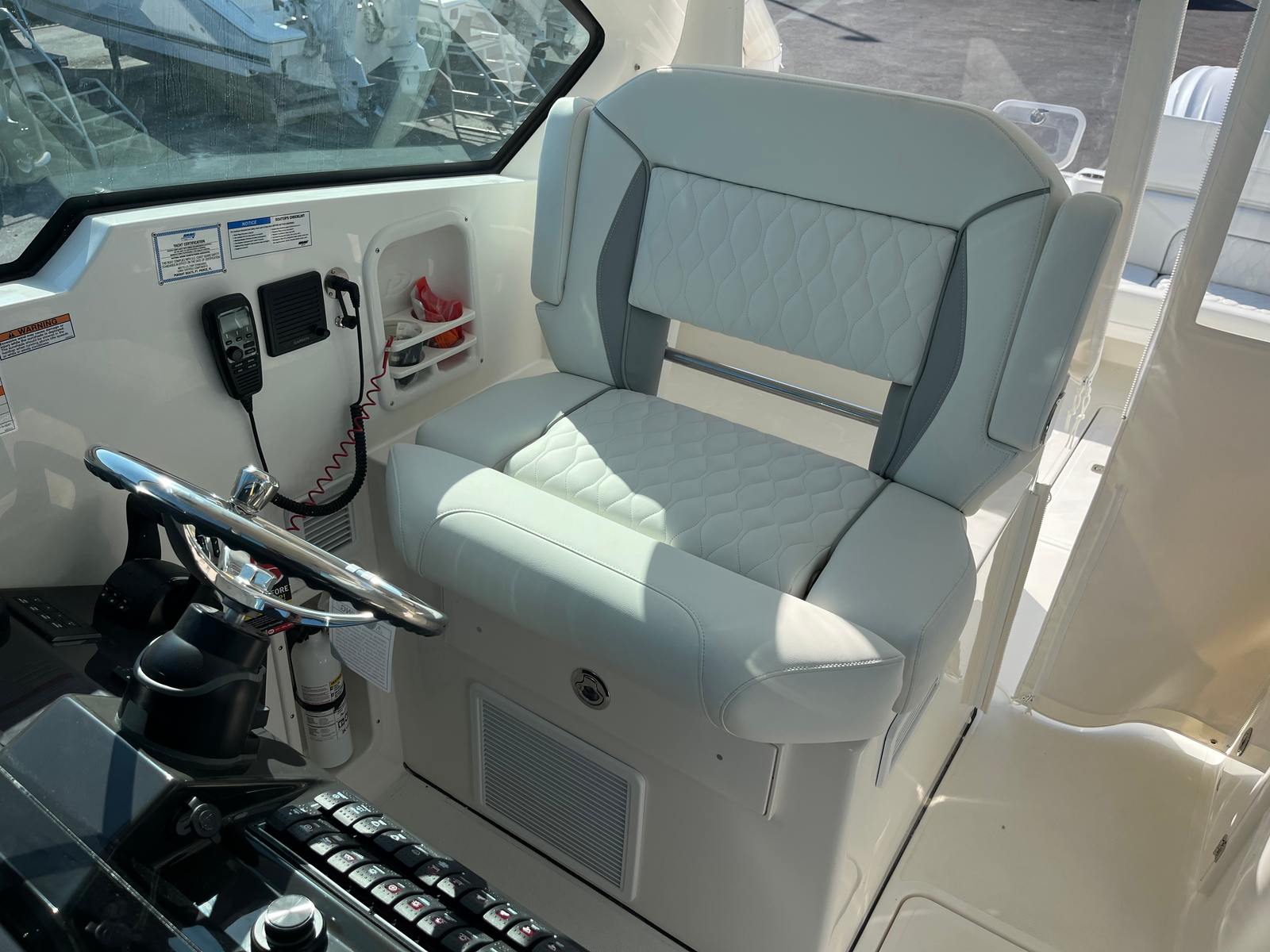 This Pursuit boat for sale is loaded with premium features designed to enhance your time on the water. The air conditioning package with reverse cycle keeps the cabin comfortable in any weather, while the diesel generator provides reliable power for extended trips. Entertain family and friends with the cockpit grill, complete with a drip pan for easy cleanup after preparing your favorite meals. The helm and footrest are finished in a stylish carbon color, adding a touch of sophistication to the command center. Every detail, from the upgraded upholstery to the tranquil sea interior, reflects Pursuit’s commitment to quality and comfort.