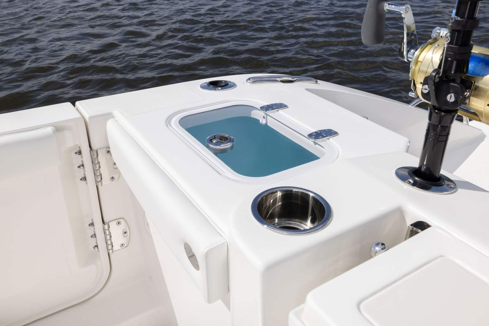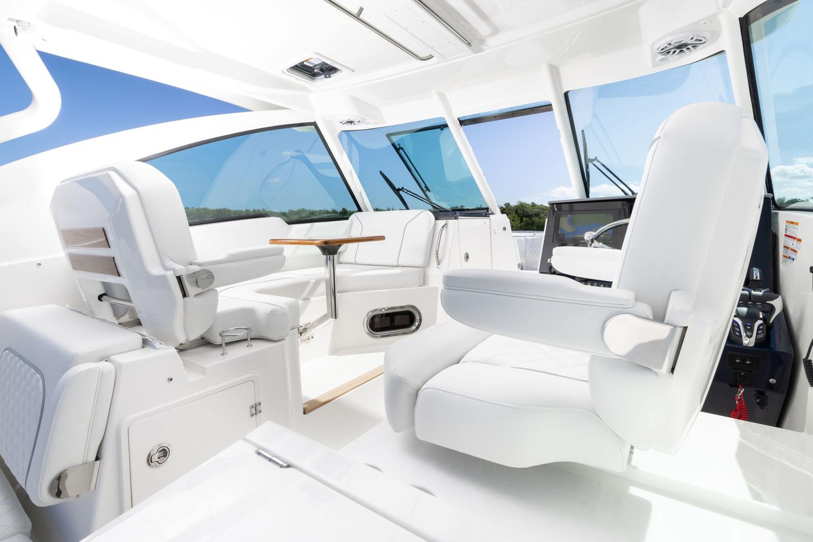 Step aboard the Pursuit DC 326 and discover a world of thoughtful features designed to enhance your boating experience. The 12V, 1.7 cu. ft. cooler with chill plate under the aft-facing seat keeps your refreshments perfectly chilled, while the bridge deck teak table with storage provides a stylish and functional centerpiece for socializing and dining. The custom retractable Makefast sunshade with one-touch operation offers instant protection from the sun, allowing you to create the perfect environment for relaxation or entertainment.Fishing enthusiasts will appreciate the hardtop-mounted rod holders (six in total), which keep your gear organized and ready for action. The DC 326’s layout is designed for maximum comfort and convenience, with spacious seating, ample storage, and easy access to all areas of the boat. Every detail, from the hull’s fresh white finish to the tranquil interior, reflects Pursuit’s commitment to quality and craftsmanship.