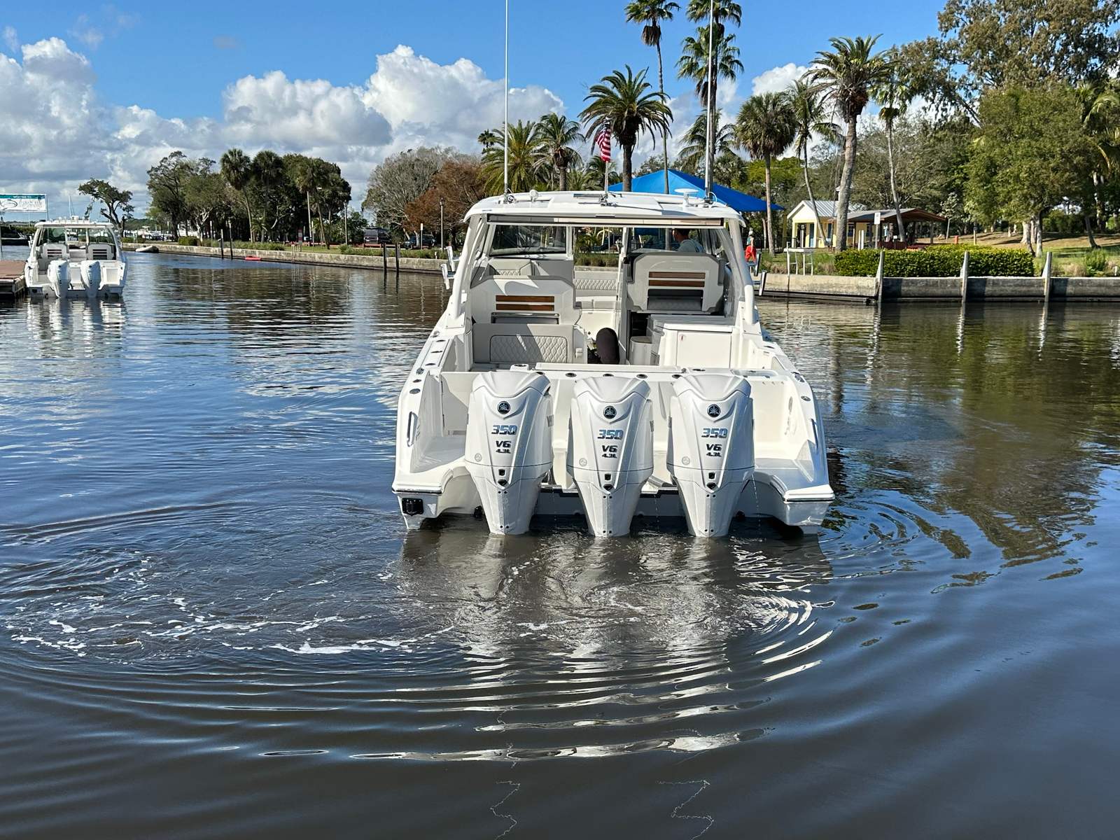 The Pursuit DC 365 is loaded with special features that enhance both functionality and enjoyment. The triple Yamaha Pearl White F350 engines not only provide impressive power but also add a touch of elegance to the boat’s overall aesthetic. The Seakeeper Gyro Stabilization System ensures a smooth and comfortable ride, making long days on the water more enjoyable for everyone on board. The hull’s fresh white color, complemented by the platinum boot stripe and accent, gives the boat a striking appearance that’s sure to impress.Inside, the Tranquil Sea interior package creates a relaxing and upscale environment, perfect for unwinding after a day of adventure. The cockpit is equipped with air conditioning, ensuring comfort even on the hottest days. The helm features a hardtop-mounted LED spotlight for enhanced visibility during nighttime excursions, while all color spectrum underwater lights add a dramatic and customizable ambiance to your evenings on the water. The upgraded amplifier and speakers with zone control and Sirius capability provide premium sound quality, allowing you to set the perfect mood for any occasion.
