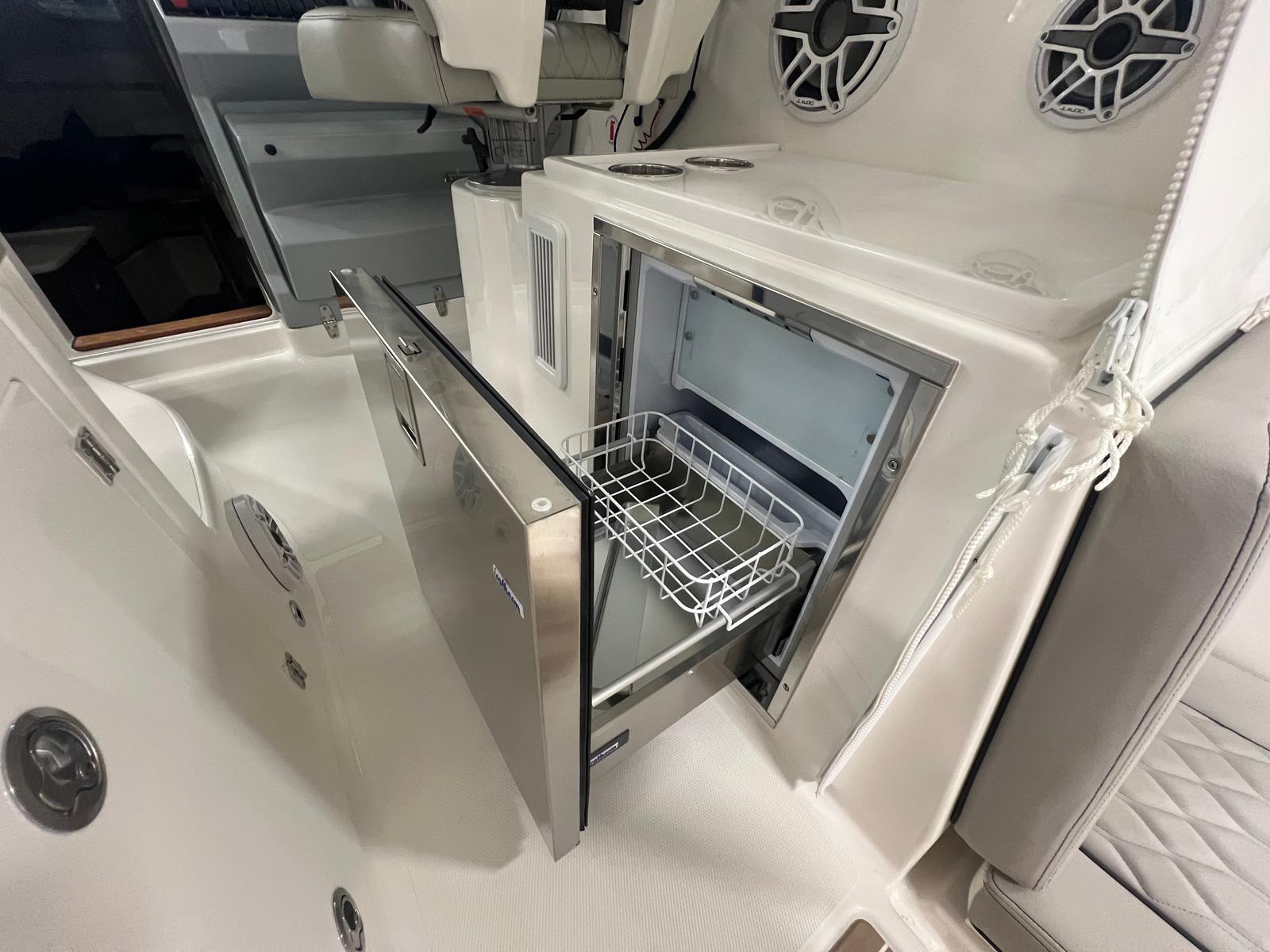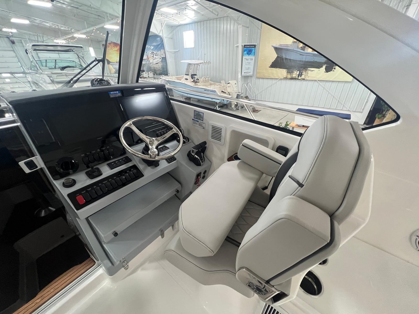 The Pursuit 325 OS is loaded with premium features designed to enhance your time on the water. For those who appreciate comfort in any climate, the cabin air conditioning with reverse cycle (10,000 BTU) and cockpit air conditioning with reverse cycle (12,000 BTU) ensure a pleasant environment, whether you are relaxing inside or entertaining guests on deck. The custom hardtop integrated electric retractable Makefast sunshade, operated with a simple one-touch mechanism, provides instant relief from the sun, allowing you to enjoy the outdoors in comfort.Aesthetically, the 325 OS is a showstopper with its black boot stripe and aft curtain, adding a touch of sophistication to its exterior. The three-piece drop curtain upgrade in white Stamoid material offers additional protection and style, ensuring you are prepared for changing weather conditions. The addition of the GMS 10 Expander for Garmin options enhances your navigation and electronics capabilities, making every journey safer and more enjoyable.Onboard, the bridgedeck teak table and fiberglass cockpit table, both with dedicated storage, offer versatile spaces for dining, socializing, or simply unwinding with a view. The folding gunwale seat on the starboard side maximizes seating options while maintaining a clean, uncluttered deck layout. These thoughtful touches make the Pursuit 325 OS a standout among cruiser boats for sale, offering both practicality and luxury.