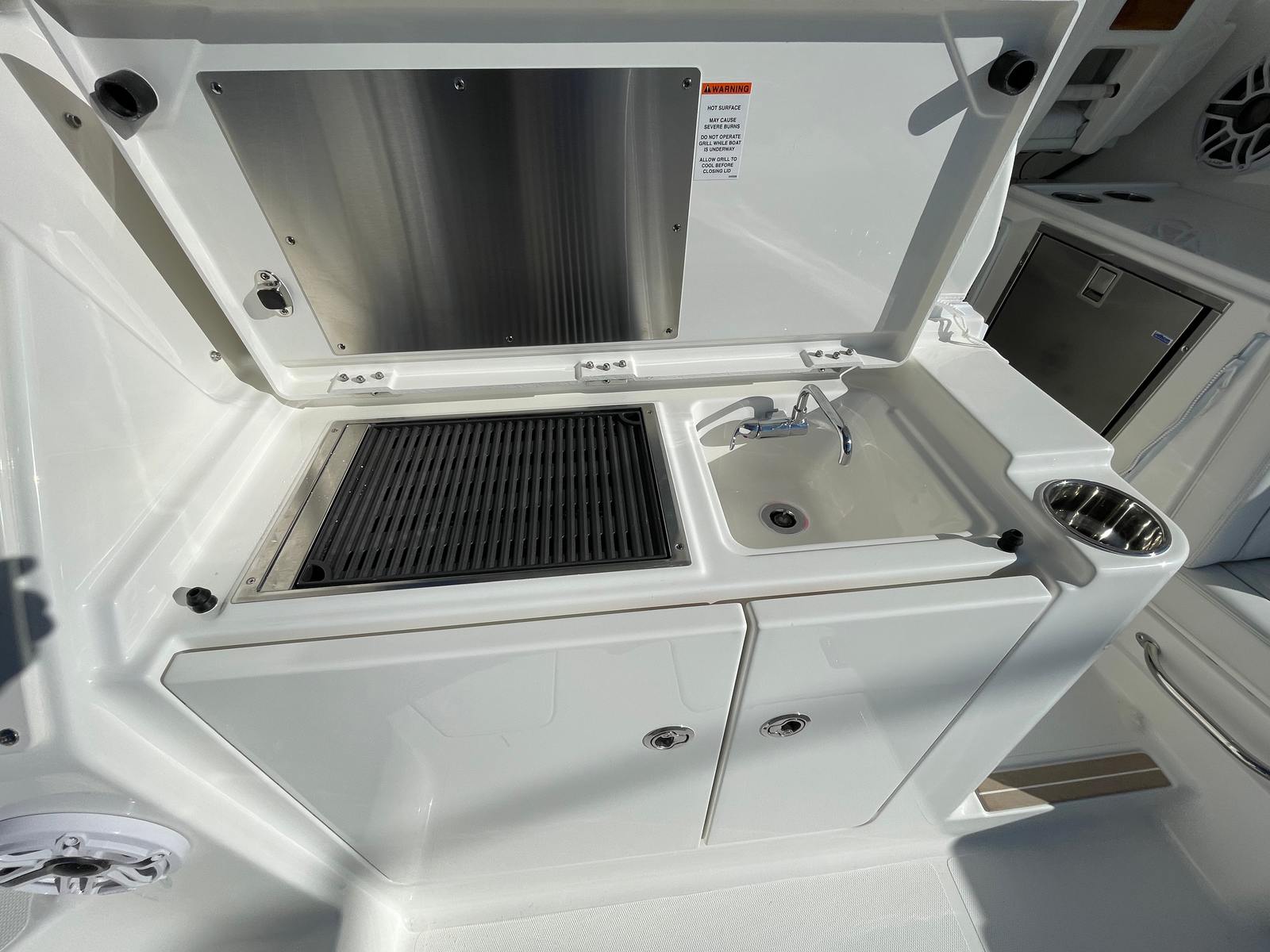 The Pursuit OS 325 is loaded with premium features that set it apart from other cruiser boats for sale. The SeaKeeper Ride 600 stabilizer enhances onboard comfort by minimizing roll, ensuring a smooth and steady experience even in choppy conditions. The helm and footrest, finished in a sophisticated carbon color, provide a modern touch and ergonomic support for long days at the wheel. Inside, the tranquil seas interior fabric and upgraded white upholstery create a serene and inviting atmosphere, perfect for relaxing after a day on the water.For those who value comfort and convenience, the OS 325 is equipped with a generator and a 16-gallon diesel tank, ensuring reliable power for extended trips. The cabin air conditioning with reverse cycle 110v/60Hz keeps the interior climate-controlled, offering respite from the summer heat or chilly evenings. Every detail, from the hull’s fresh white finish to the navy bootstripe, reflects Pursuit’s commitment to quality and style.