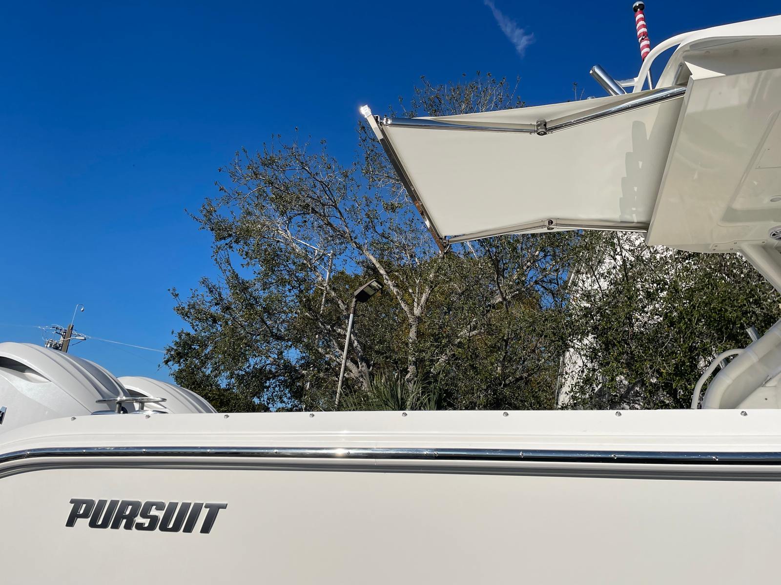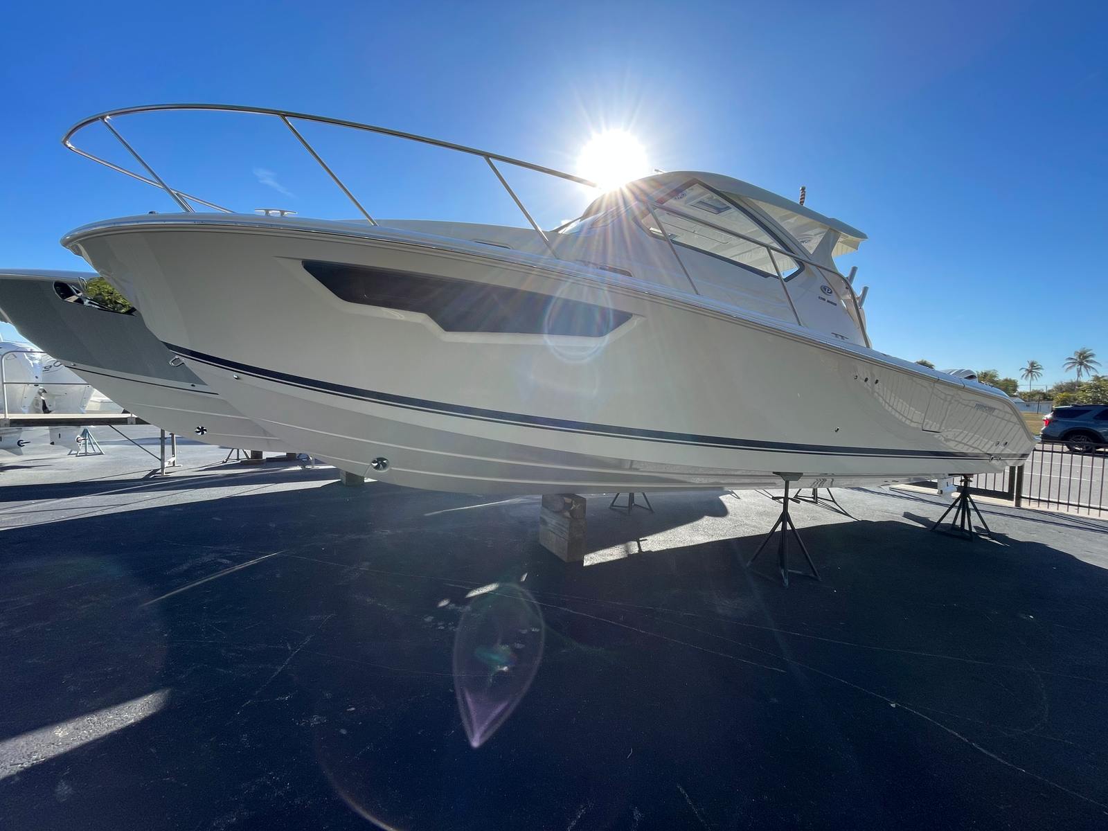 The 2026 Pursuit OS 325 is a 34.5-foot cruiser that exemplifies modern craftsmanship and innovation. Its sleek profile, highlighted by a fresh white hull and a striking navy bootstripe, ensures you will turn heads at every marina. As a new model, this Pursuit boat for sale offers the latest advancements in comfort, performance, and style, making it an exceptional choice for discerning boaters. The OS 325’s spacious layout is thoughtfully designed to maximize both relaxation and functionality, providing ample room for entertaining, lounging, and overnight stays.