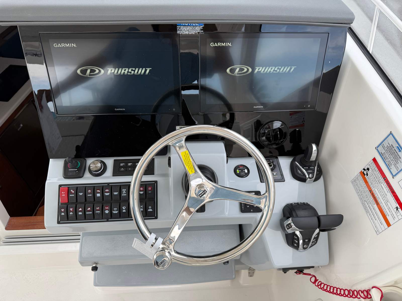 Step into a world of luxury and convenience with the Pursuit 355 OS’s array of special features. The Platinum bootstripe not only enhances the boat’s aesthetic appeal but also signals its premium status. Entertain guests or enjoy family meals around the Bridgedeck Teak Table, which comes with dedicated storage for added practicality. The black canvas provides shade and protection, while the cockpit air conditioning ensures a cool and comfortable environment even on the hottest days.Experience the ultimate in versatility with the custom hardtop, featuring an integrated stainless steel electric retractable Makefast sunshade with one-touch operation. This innovative feature allows you to effortlessly adjust your shade preferences, maximizing comfort and enjoyment. The fiberglass cockpit table, also equipped with dedicated storage, offers a durable and stylish surface for dining or socializing. The folding gunwale seat on the starboard side provides flexible seating options, while the forward deck sunpad invites you to relax and soak up the sun.For those who prioritize navigation and safety, the Garmin Radar Open Array GMR Fantom 54 delivers advanced radar capabilities, ensuring you can confidently explore new waters. The hardtop aft curtain upgrade in Stamoid white adds a refined finishing touch, enhancing both aesthetics and protection from the elements.