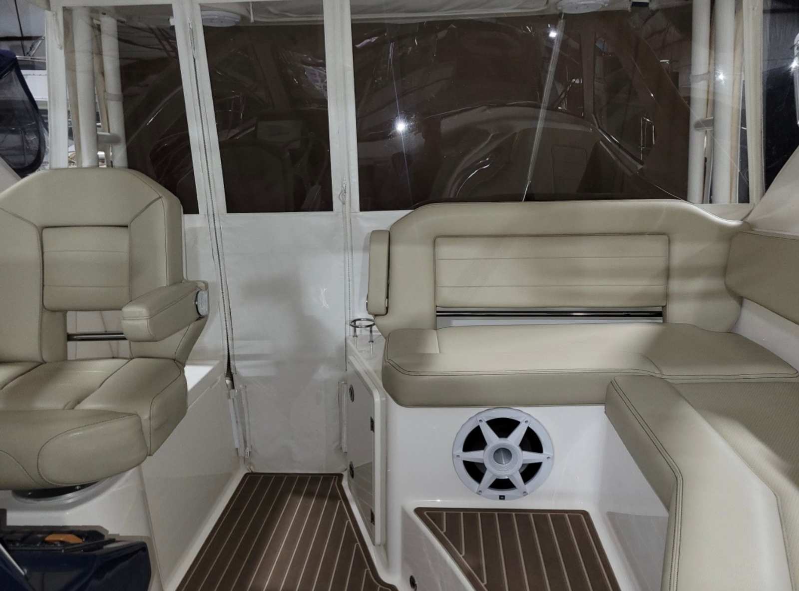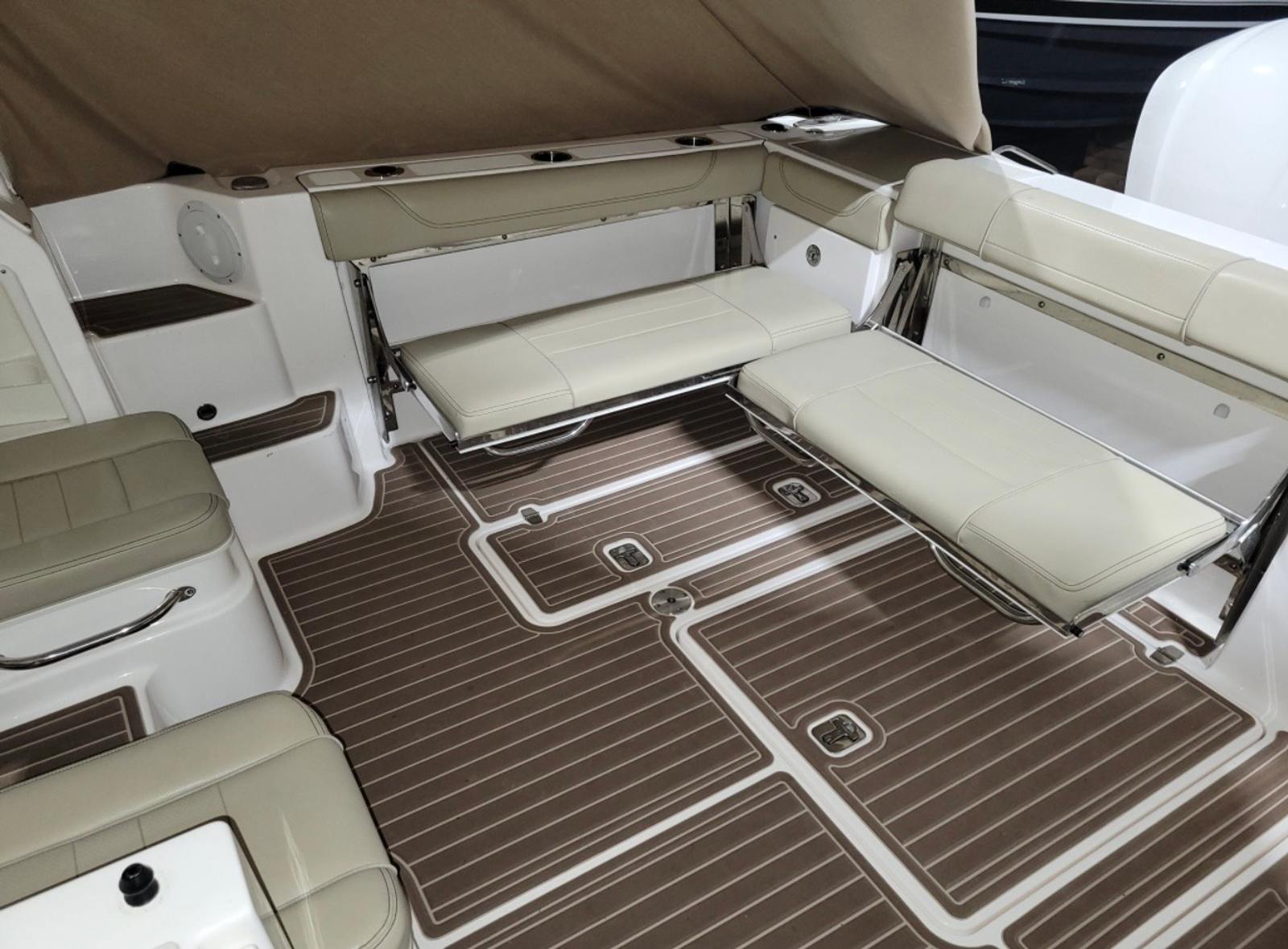 Beyond its luxurious features, the Pursuit 355 OS excels in practicality. The ample storage options allow you to keep your gear organized and easily accessible, whether you’re packing for a day trip or an extended voyage. The cockpit cover and drop curtain offer protection from sun and rain, helping to maintain the boat’s condition and ensuring comfort for all aboard. Docking and maneuvering are made easier thanks to the responsive twin engines and advanced controls, giving you confidence in tight spaces and busy marinas. The battery charger ensures your onboard systems remain operational, while the Sea Deck carpet provides a non-slip surface that’s both comfortable and safe. The inclusion of a cockpit grill and wet bar means you can enjoy gourmet meals and refreshing beverages without ever leaving the water, enhancing the overall boating experience.