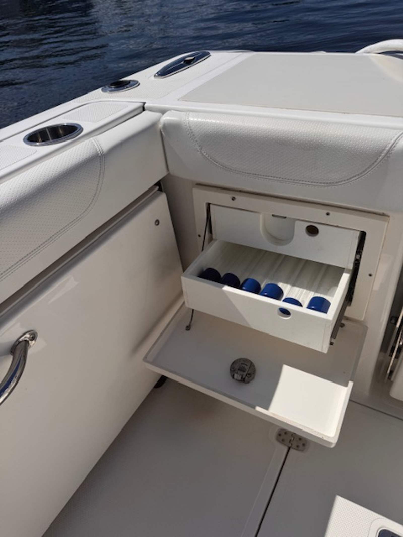 Power and precision define the performance of the Pursuit OS 355. Equipped with three robust engines, this cruiser delivers a combined 900 horsepower, ensuring exhilarating speed and smooth handling in a variety of conditions. With only 430 engine hours, the engines are in excellent condition and promise reliable performance for years to come. Whether you are cruising along the coastline, heading out for a weekend getaway, or simply enjoying a day on the water, the Pursuit OS 355 offers the power and agility you need for a thrilling boating experience.