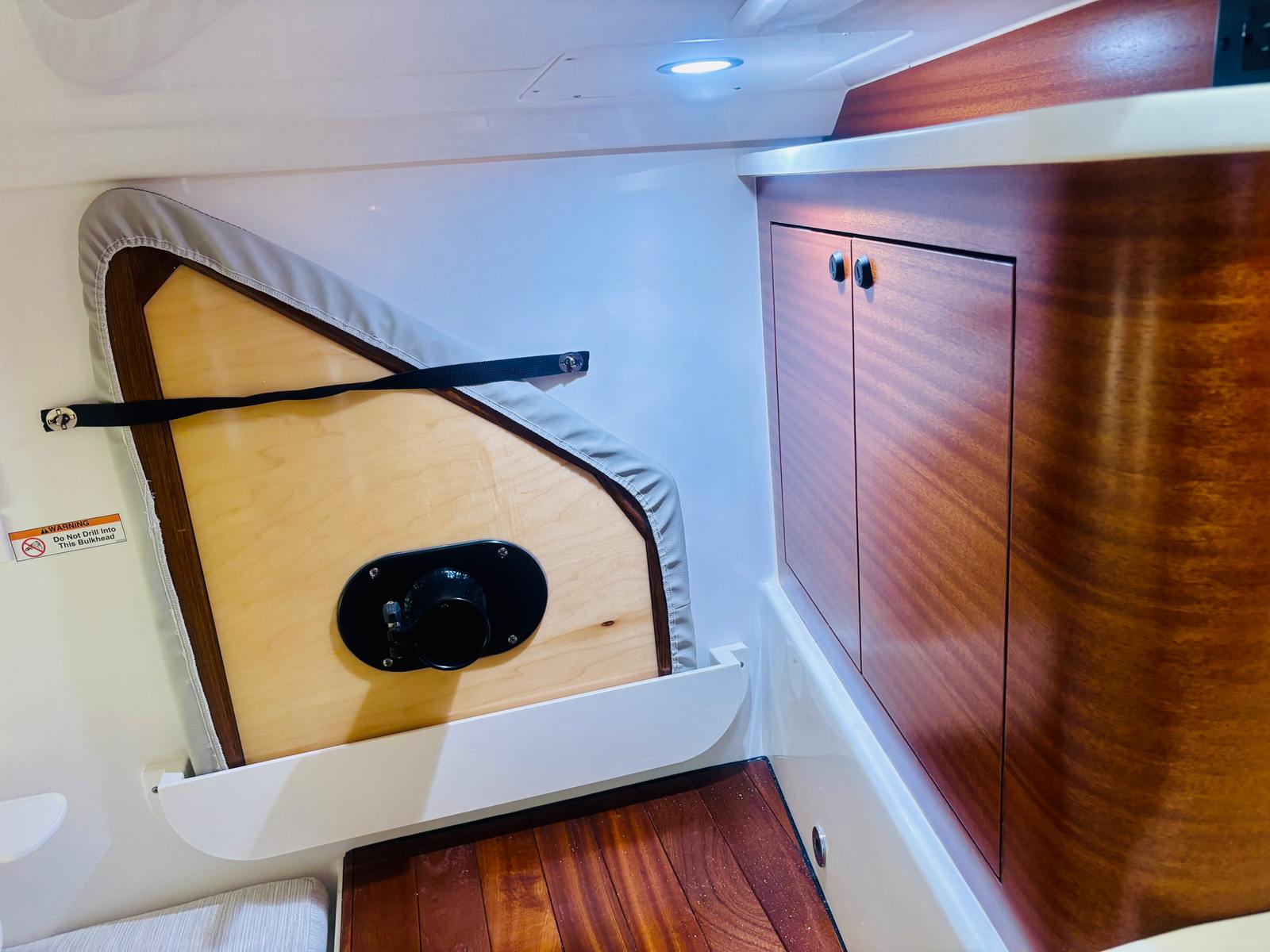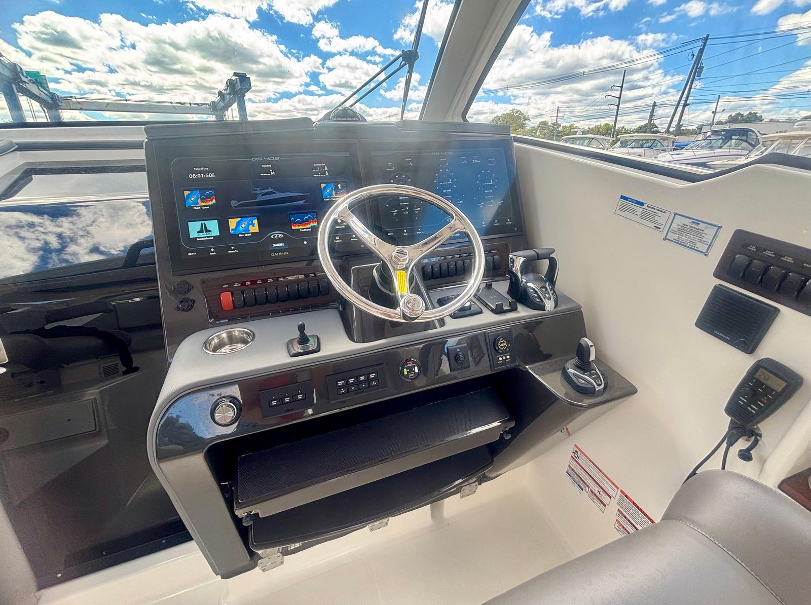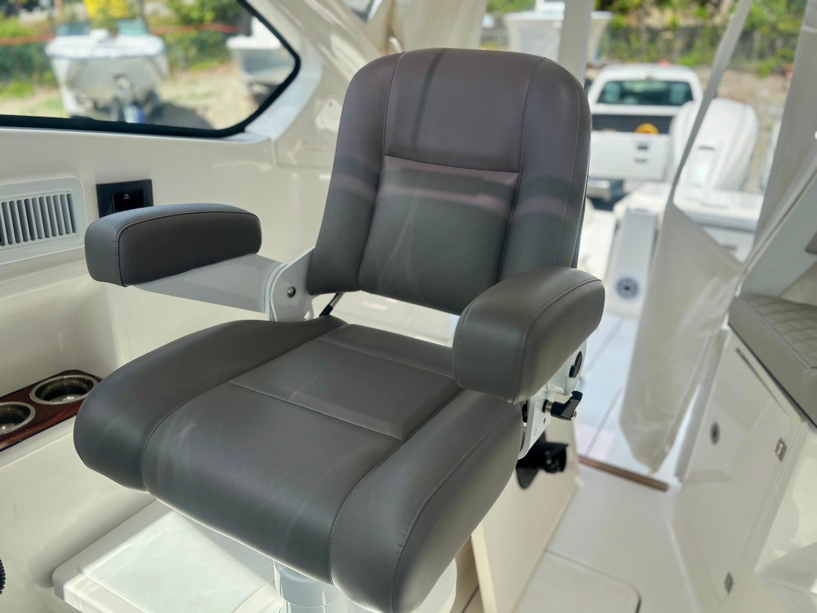 The Pursuit OS 405 is loaded with premium features that elevate your boating experience. The custom hardtop boasts an integrated electric retractable Makefast sunshade with one-touch operation, allowing you to effortlessly adjust your shade and comfort level. White Stamoid upgrades on the side curtains, sunpad cover, and drop curtain add a touch of elegance and durability, ensuring protection from the elements while maintaining a sophisticated look.Stay informed and entertained with the SiriusXM® receiver for weather updates, and enjoy seamless navigation with the Garmin 2nd widescreen 22" display (STD) and multifunction display interface. The manual engine flushing system simplifies maintenance, while the exterior upholstery in Sea Salt and the bold black bootstripe enhance the boat’s visual appeal. Every detail of the Pursuit OS 405 has been thoughtfully designed to maximize convenience, style, and functionality.