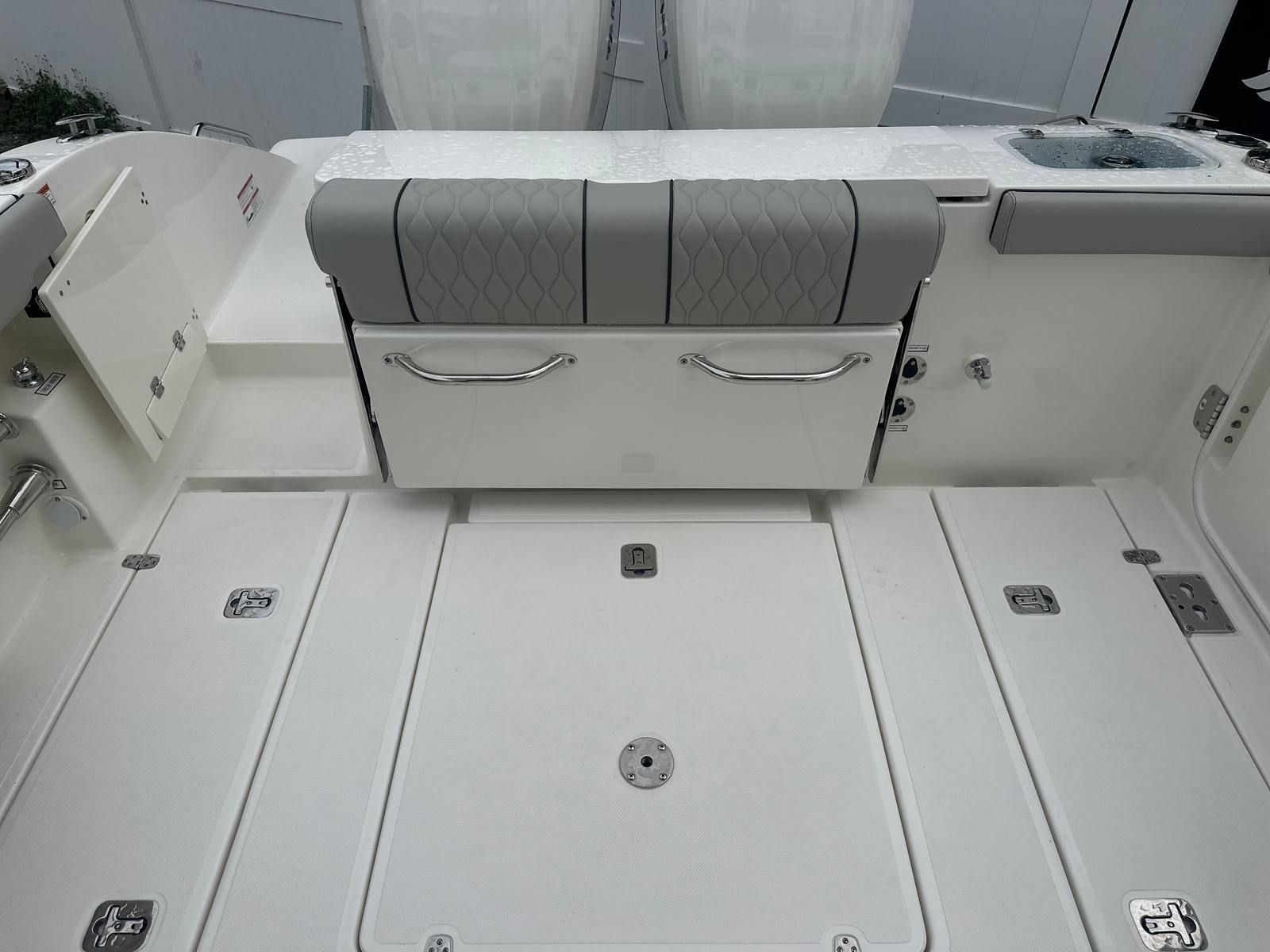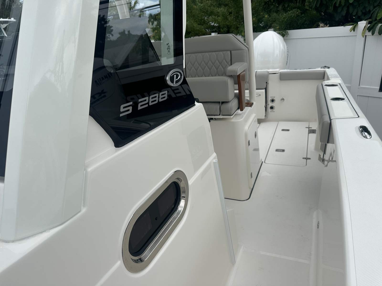 This Center Console boat for sale is equipped with a host of premium features designed to elevate your time on the water. The hullside boarding door ladder provides easy access for swimmers and guests, while dockside power with a battery charger ensures your electronics and amenities are always ready for use. The all-color spectrum underwater lights, mid-level accent lights, and blue LED lighting create a vibrant and inviting ambiance, perfect for evening cruises or entertaining friends and family. Every detail of the Pursuit S 288 has been thoughtfully designed to enhance comfort, safety, and enjoyment.