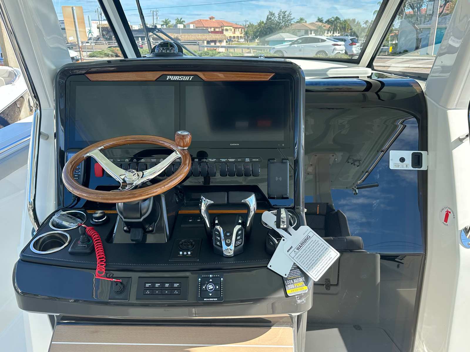 - Helm - Premium Upgrade: Edson Solid Teak Steering Wheel with Power Knob, Leather-Wrapped Dash Pad (Black), Synthetic Teak Flooring on Helm Footrest Treads and Teak Accents on Dash Storage Pockets and Entertainment Center