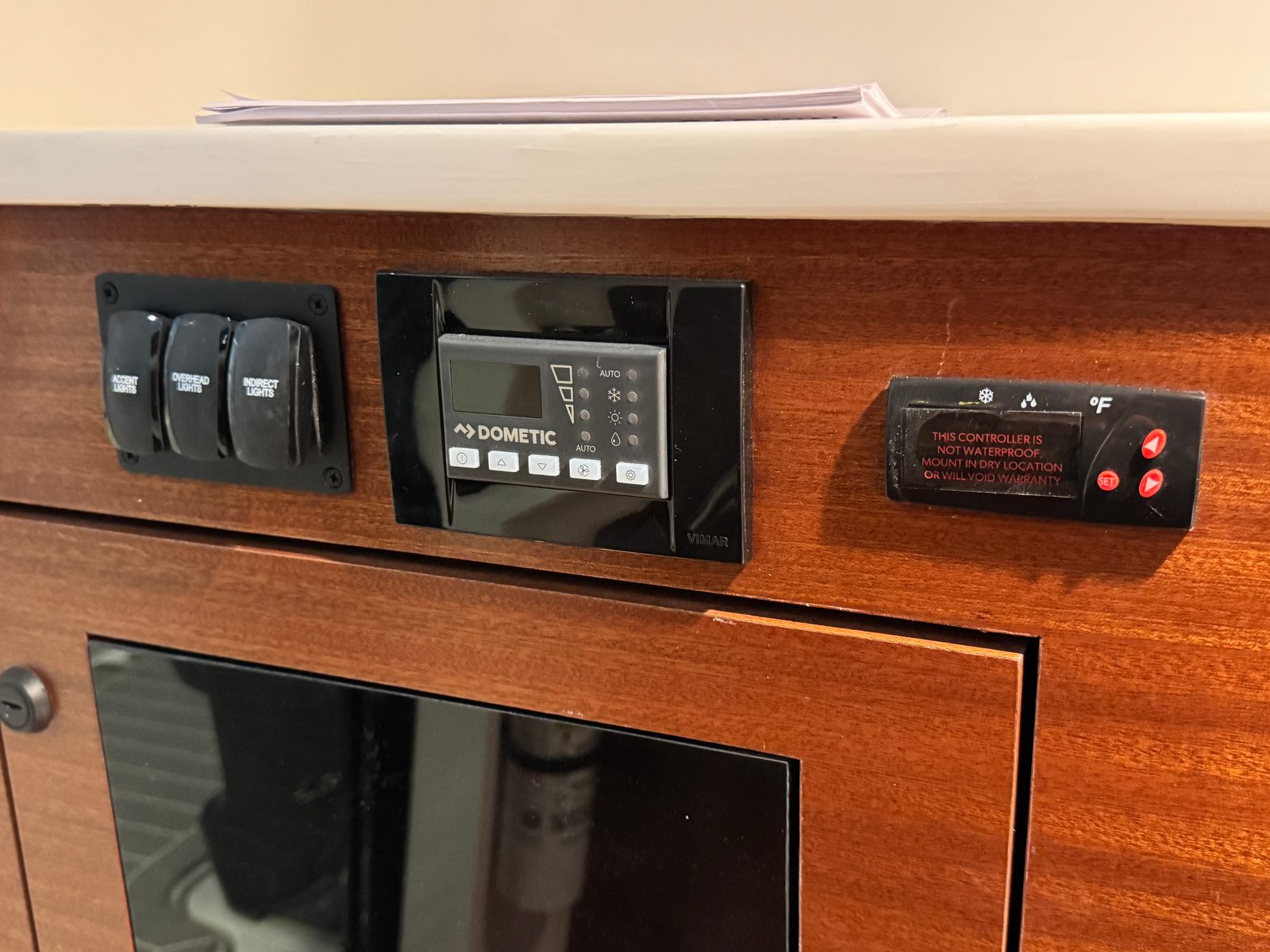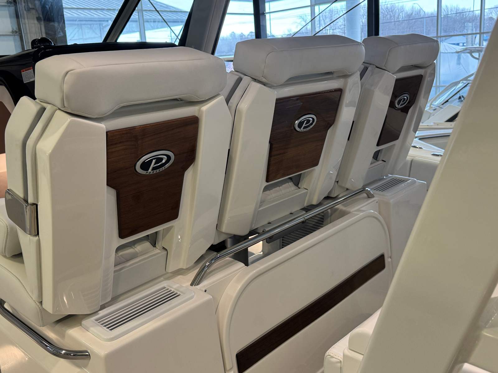 - Helm - Premium Upgrade: Edson Solid Teak Steering Wheel with Power Knob, Leather-Wrapped Dash Pad (Black), Synthetic Teak Flooring on Helm Footrest Treads and Teak Accents on Dash Storage Pockets and Entertainment Center. Select Color: (Biscuit or Smoke) (Color must match Helm and Entertainment Area Flooring if selected)
