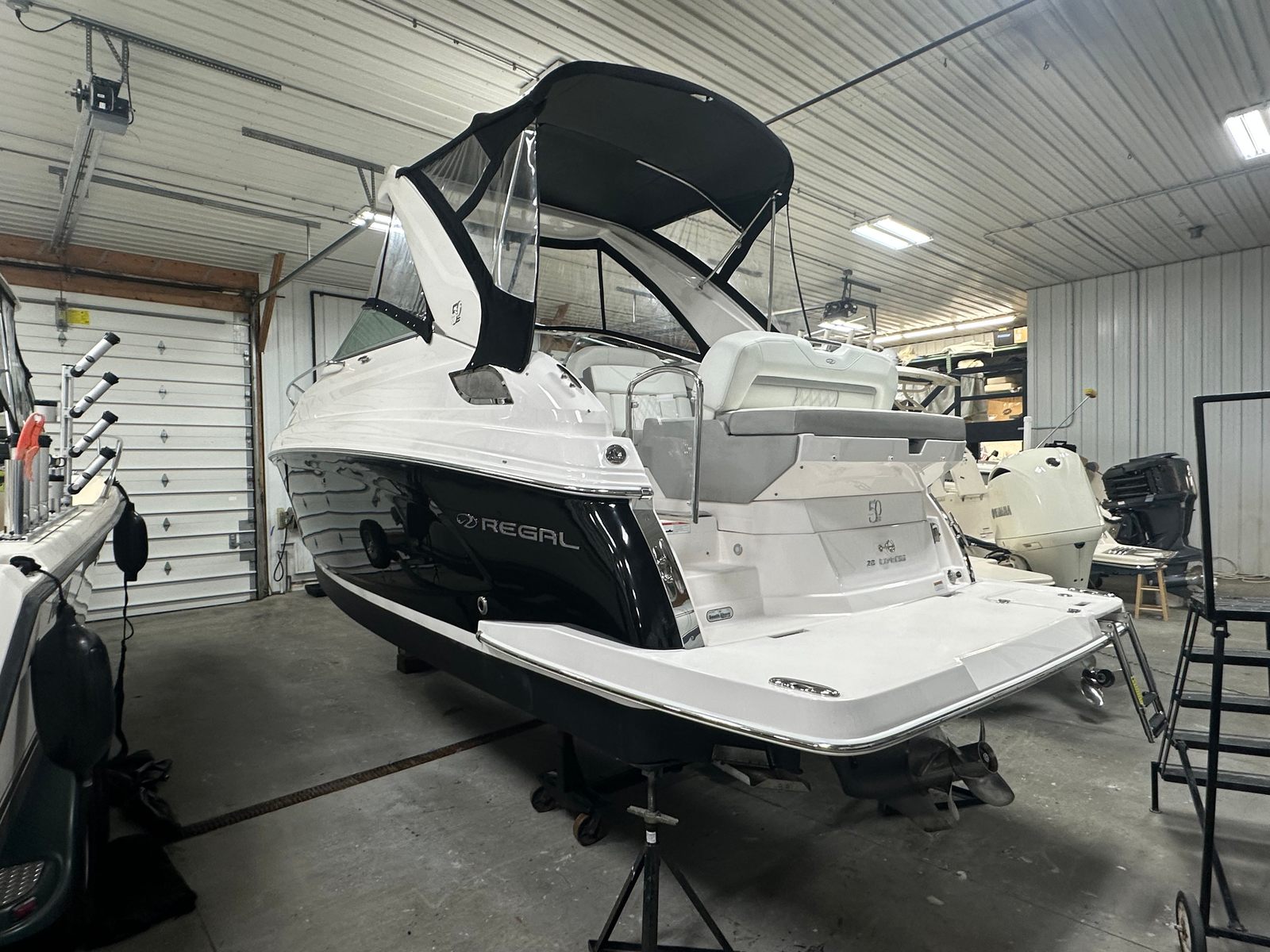 Owning the Regal 28 Express means embracing a lifestyle of fun, relaxation, and connection. This cruiser boat for sale is designed for comfort, with spacious seating areas that invite conversation and laughter. The aft bench seat is ideal for lounging with friends, while the cockpit wet bar transforms every outing into a celebration. The Sea Grass Snap In carpet adds a plush feel to the cockpit, enhancing the overall ambiance and making barefoot days on the water even more enjoyable. The thoughtful storage solutions and elegant cabinetry ensure that everything you need is within reach, allowing you to focus on making memories rather than managing clutter. The camper enclosure and black canvas offer flexibility, so you can enjoy the boat in sunny or rainy conditions, extending your time on the water and maximizing your investment.