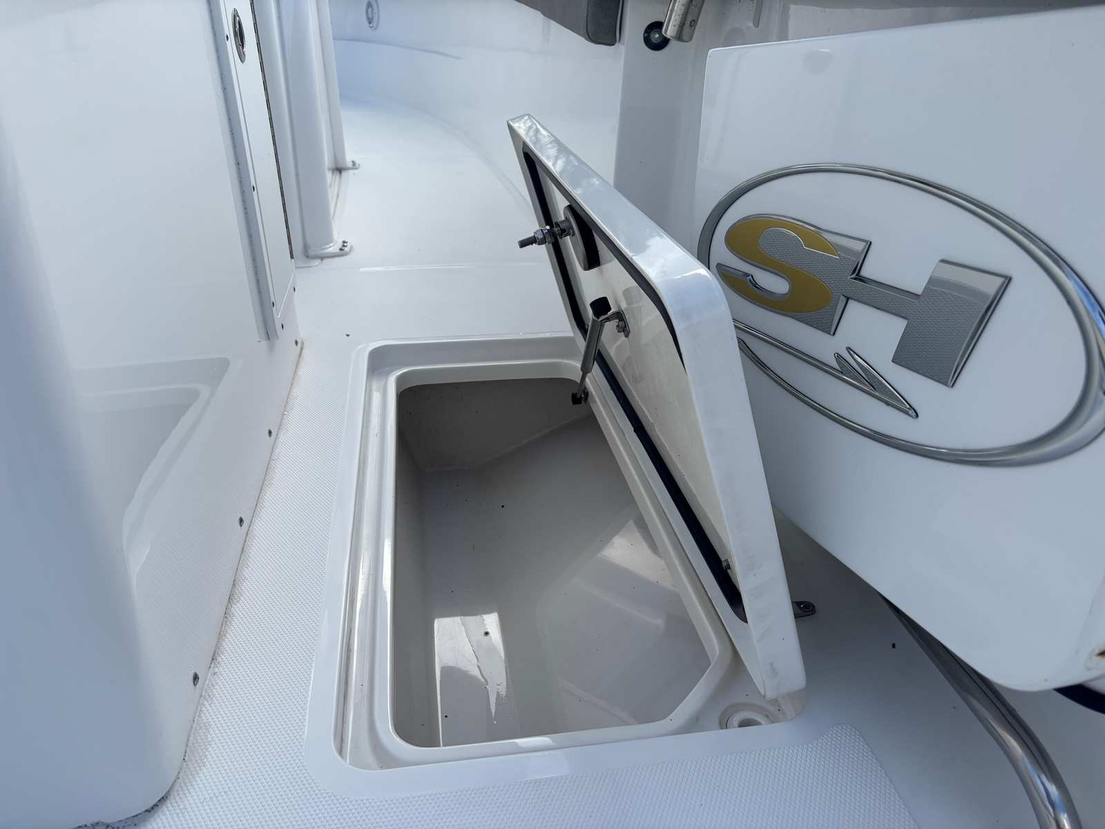 Powering this impressive vessel are twin engines, delivering a combined 600 horsepower. With only 55 engine hours, these engines provide robust and reliable performance, ensuring you have the power you need for offshore fishing, cruising, or water sports. The dual-engine setup not only enhances speed and acceleration but also offers added safety and maneuverability, making it easier to navigate a variety of water conditions. Whether you’re chasing the next big catch or enjoying a day of island hopping, the Sea Hunt 28 Gamefish CB’s performance capabilities are sure to impress.