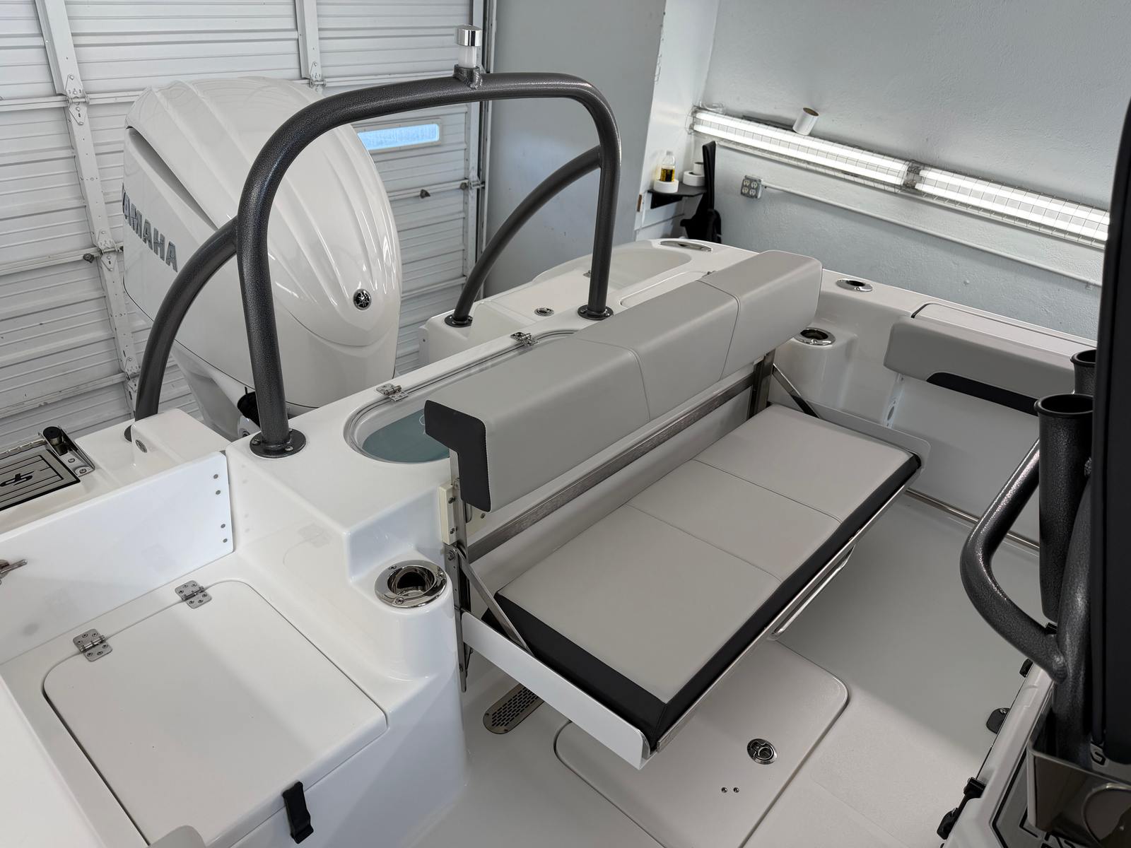 This Center Console boat is as practical as it is fun. The 23.75-foot length strikes the perfect balance between spaciousness and maneuverability, making docking and storage straightforward even in tighter marinas. The advanced Yamaha Digital rigging ensures that operating the boat is intuitive and hassle-free, whether you are an experienced captain or a first-time owner.The ski tow bar adds versatility, allowing you to switch seamlessly from fishing to water sports. The pump out head is a valuable addition for longer excursions, providing comfort and convenience for all aboard. The stainless steel cup and rod holders keep your essentials organized, while the sun shade bow offers respite from the sun, making extended days on the water more enjoyable.