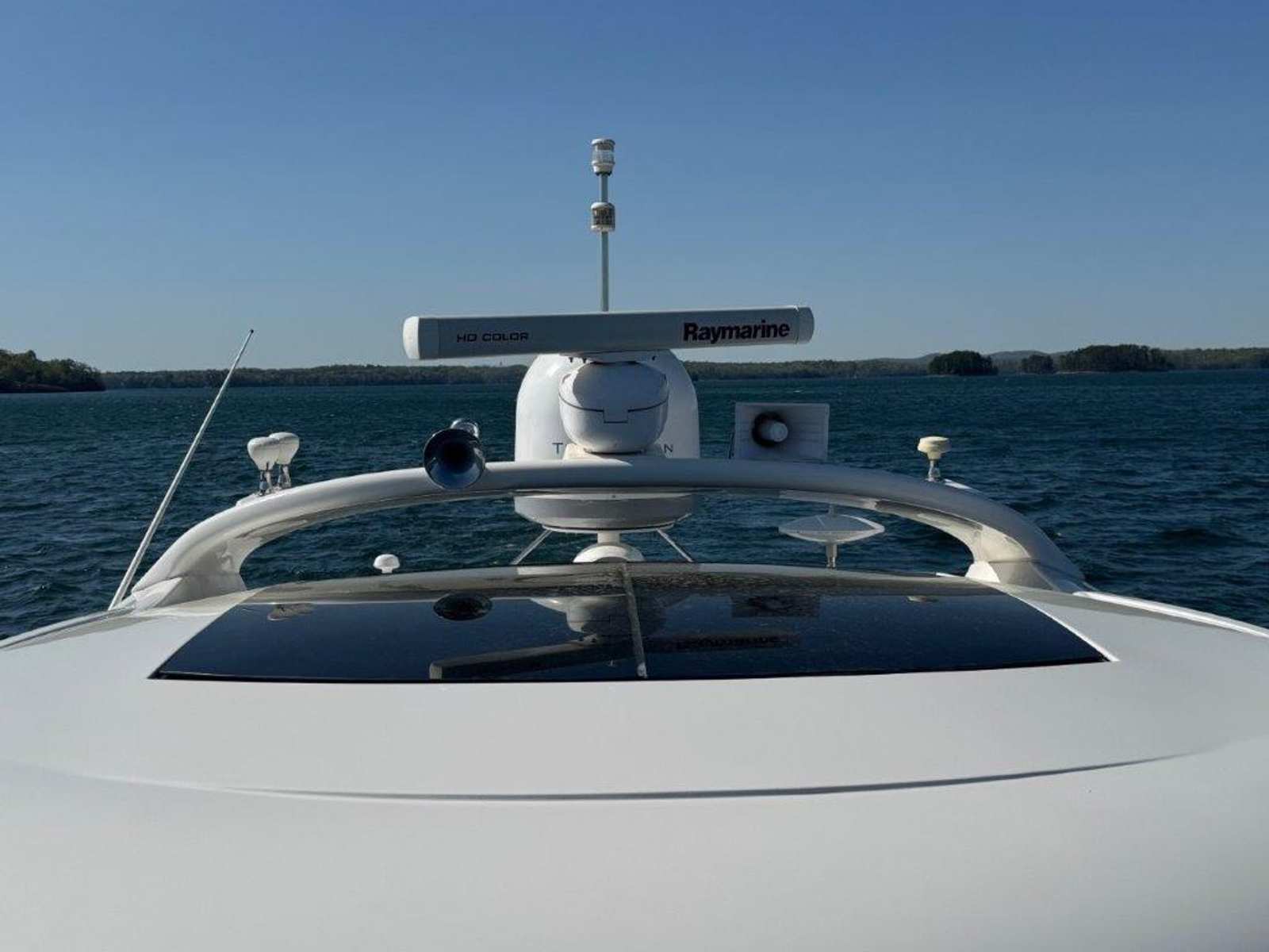 The hull is a sleek, clean white, and features a hydraulic swim platform—perfect for launching a tender or enjoying the water with ease.