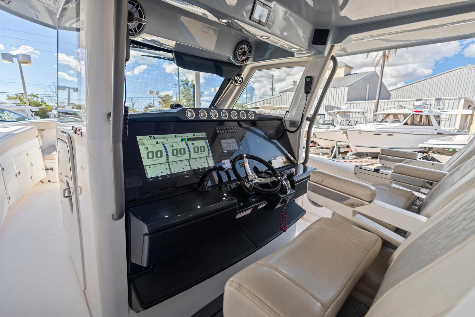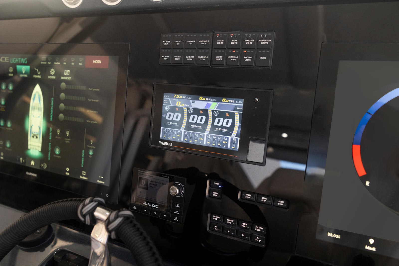 Powering the Solace 41 CS are three Yamaha V8 425 XTO outboard engines, delivering a combined 1275 horsepower. These triple engines, finished in Pearlescent White, offer exhilarating acceleration, smooth cruising, and reliable offshore capability. With the advanced Helm Master system, you’ll enjoy precise control and effortless maneuvering, whether docking in tight spaces or navigating open waters. The low engine hours further ensure that these engines are ready to provide years of dependable performance, making this Center Console boat for sale a smart investment for serious boaters.