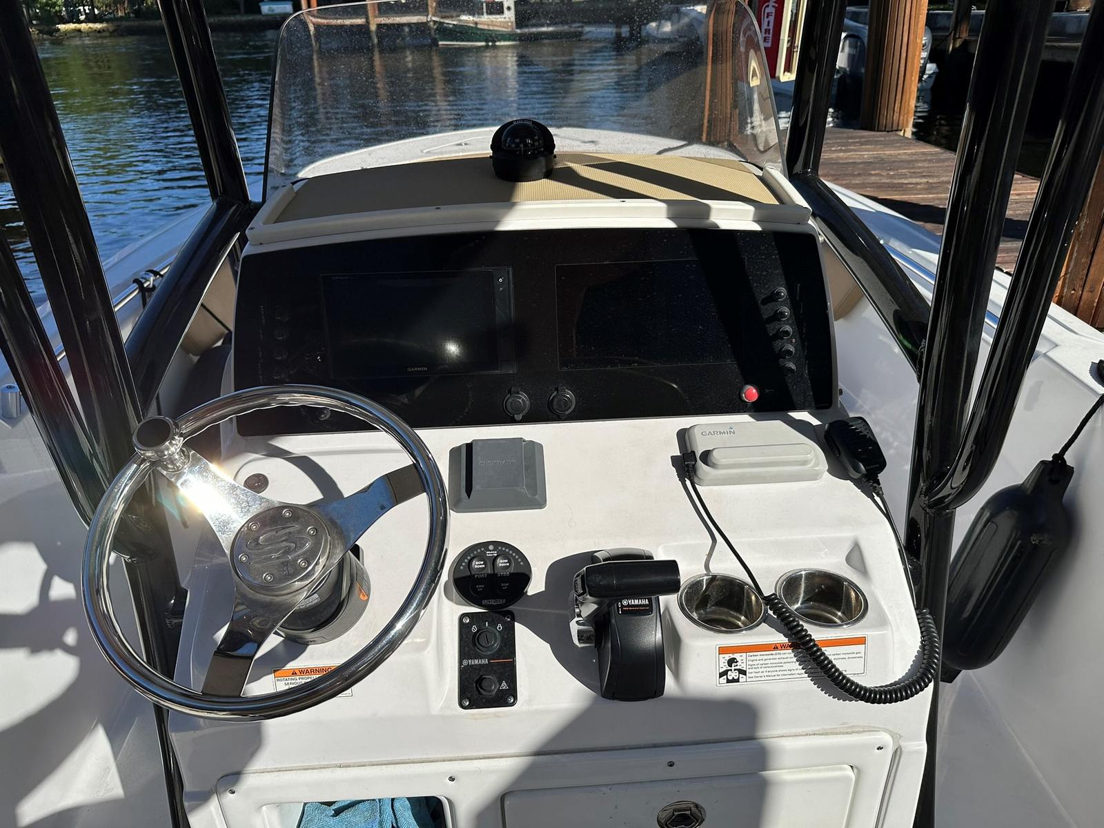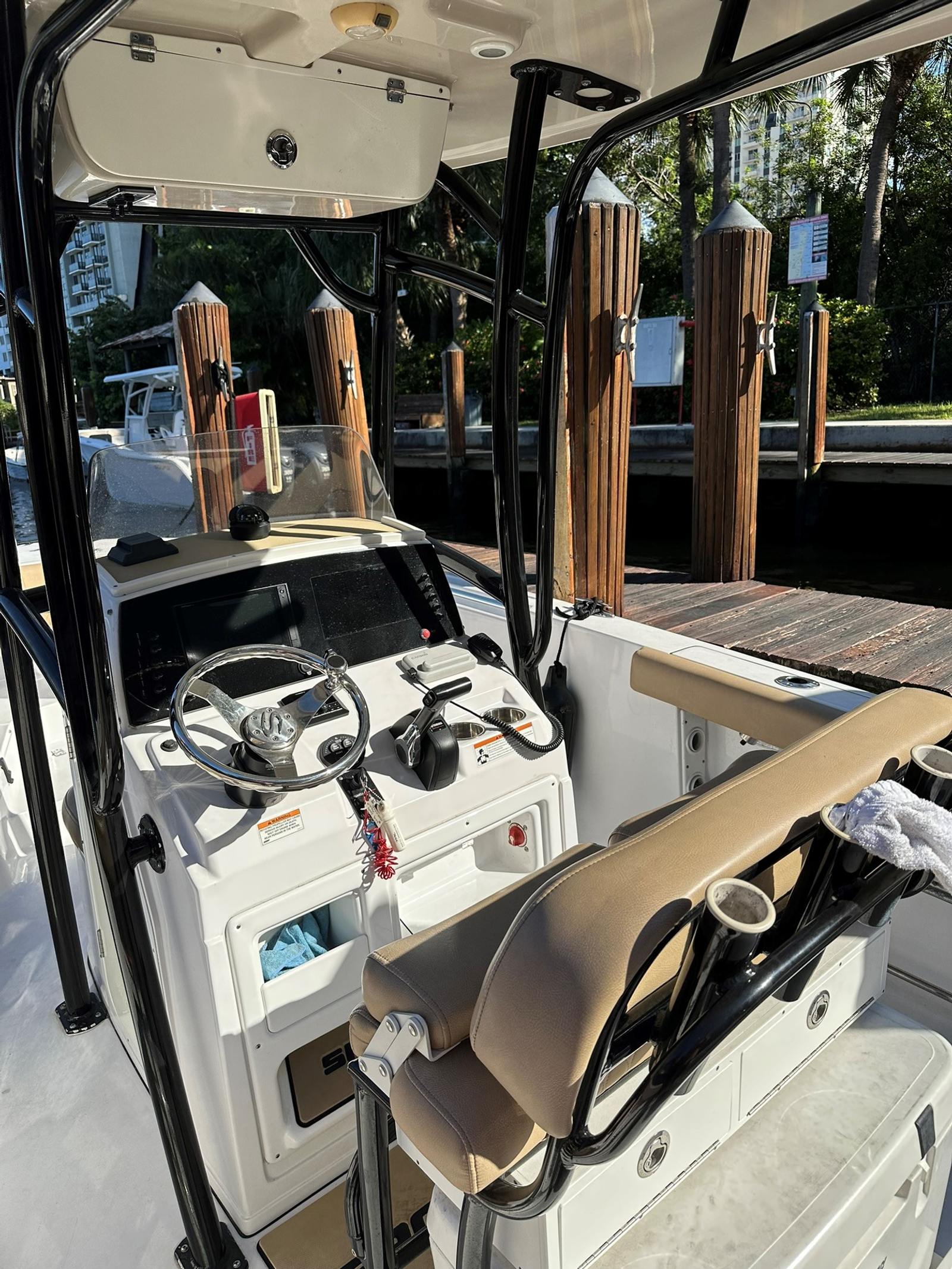 Leaning post seat with flip-up sea bottoms, rod holders and YETI cooler underneath with slide-out holder.