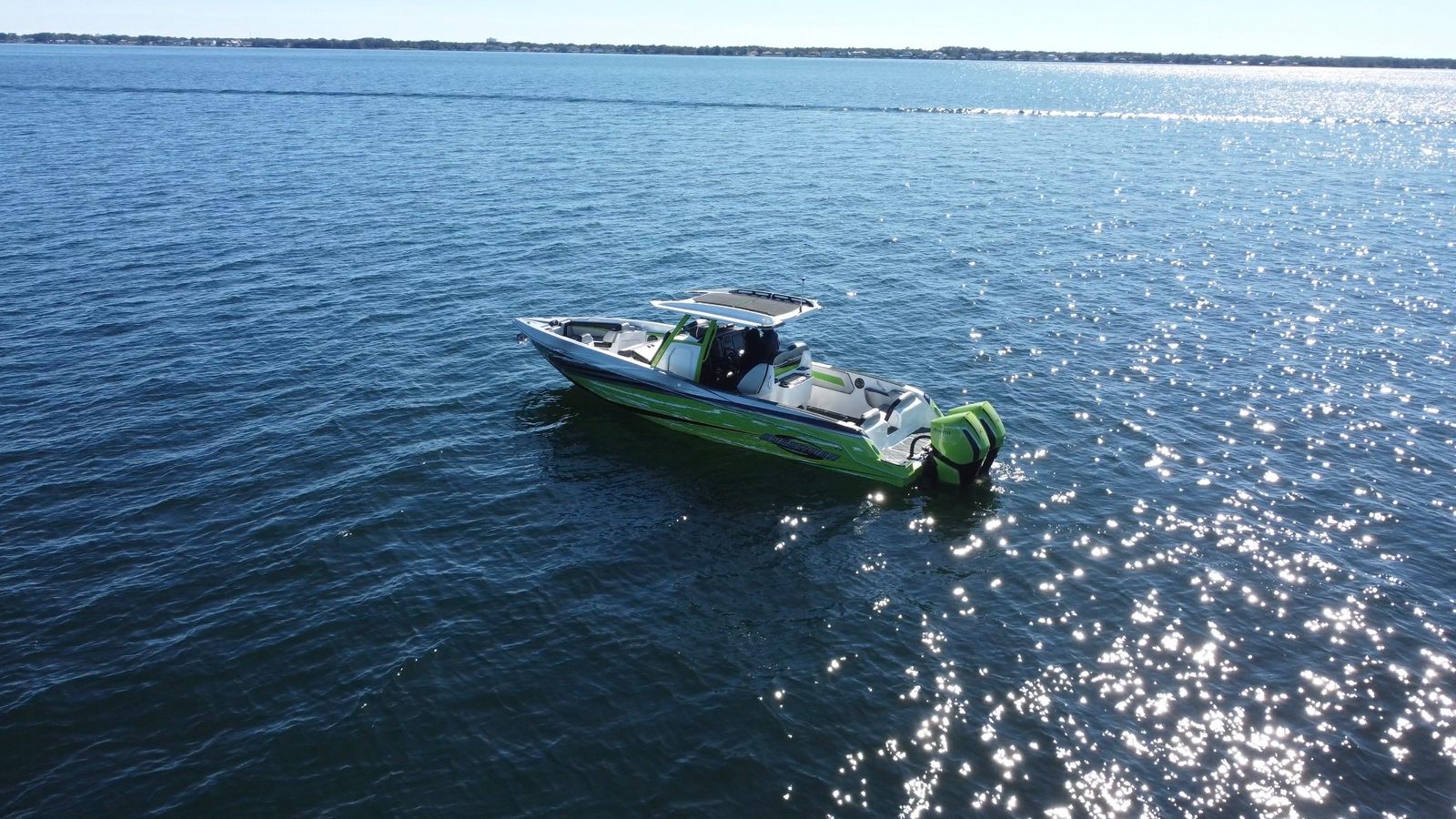 Prepare to turn heads everywhere you go with this stunning 2020 Sunsation 32 CCX. Finished in a custom, high-impact lime green and black graphics package, this boat is the perfect fusion of exhilarating performance and center console versatility. With only 133 hours on its twin Mercury Racing 450R engines, this vessel is barely broken in and presents in immaculate condition.