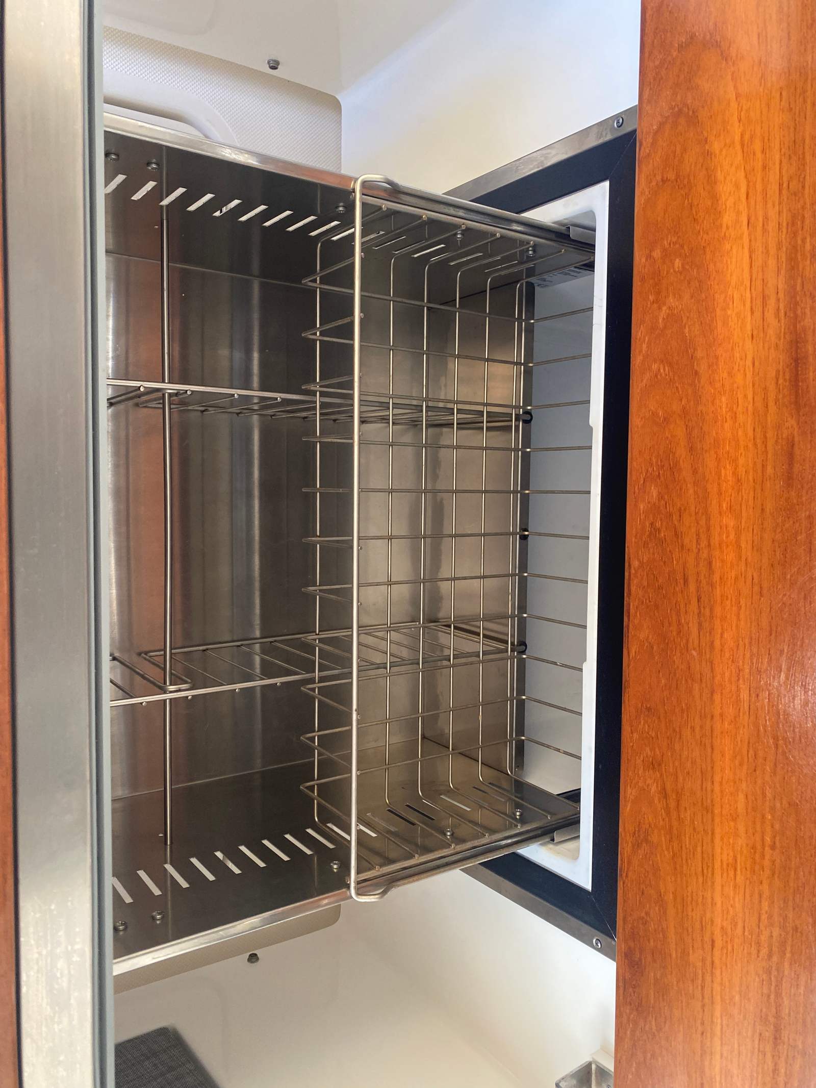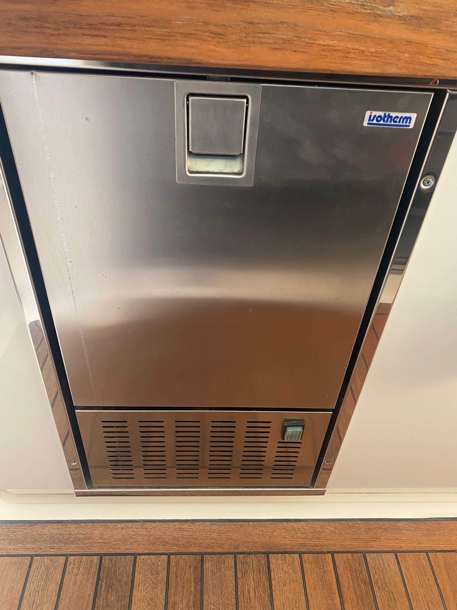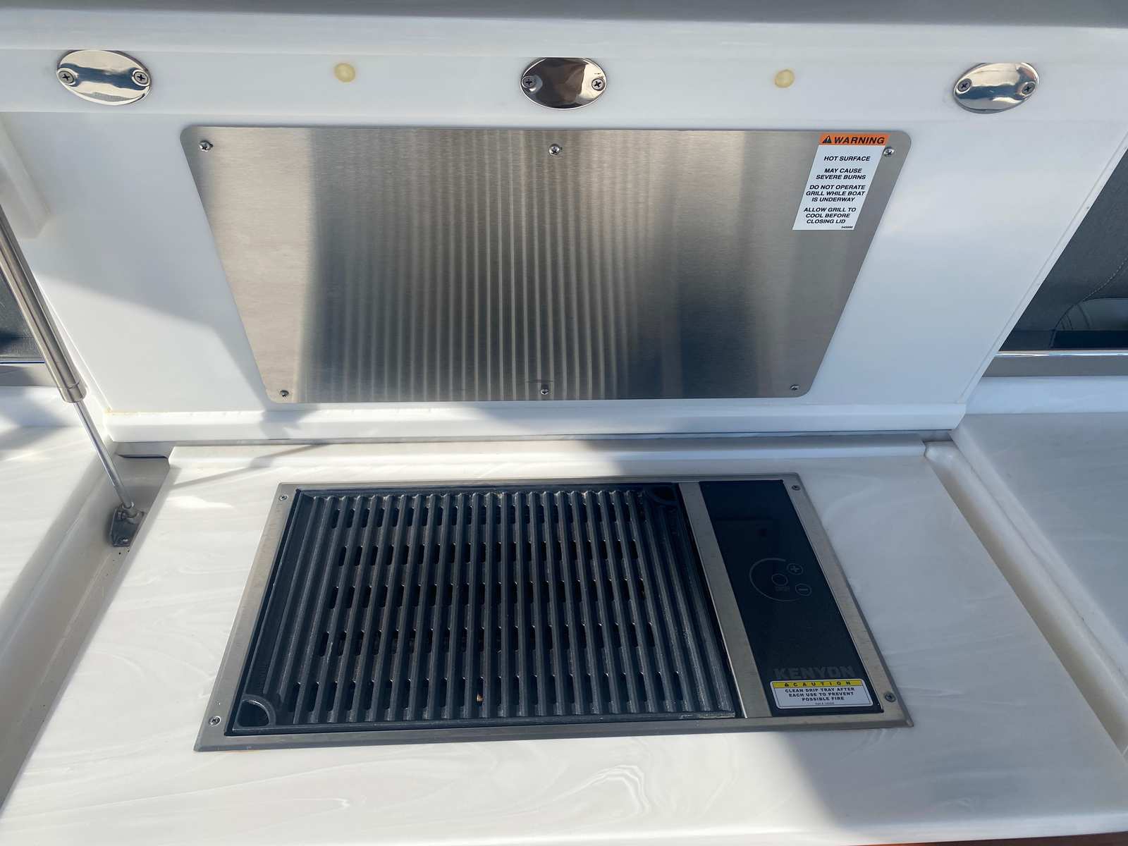 • Aft Cockpit: The focal point for entertaining features an island-style outdoor galley, complete with a stainless steel sink, storage drawers, a refrigerator (specifics provided in user prompt: icemaker), and an electric cockpit grill. The innovative U-shaped lounge seating and teak table rotate 180 degrees to face the water or the cockpit, and can convert into a large sunpad.