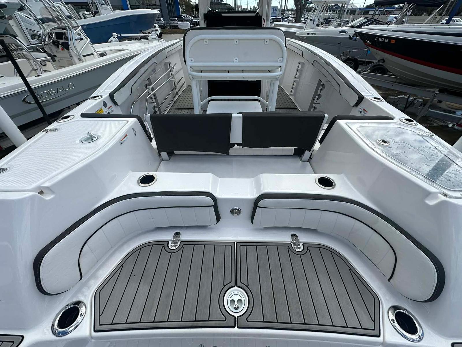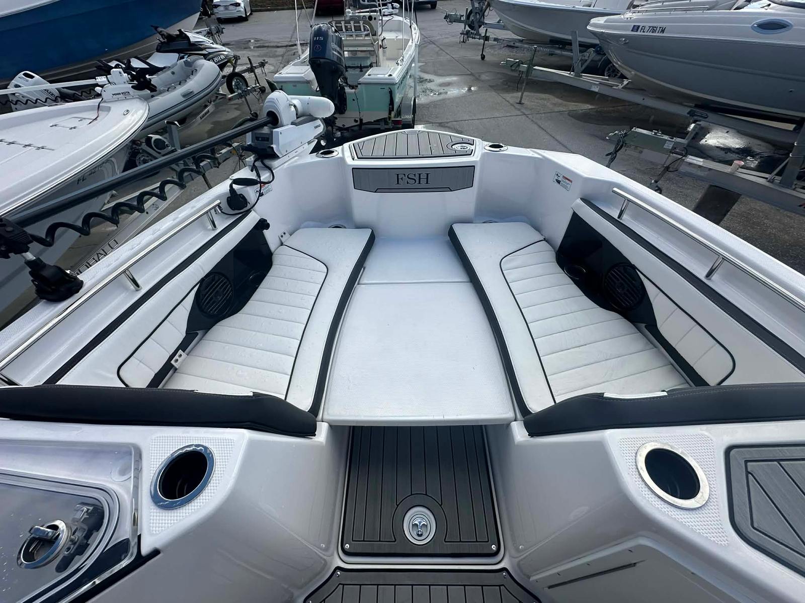 The Yamaha 255 FSH Sport is packed with features designed to enhance your time on the water. Its spacious 24-foot layout provides ample room for passengers, gear, and activities. The dual-engine setup not only boosts performance but also adds a layer of reliability and safety, ensuring peace of mind during every outing. The innovative jet propulsion system eliminates the need for exposed propellers, making it safer for swimmers and ideal for shallow-water exploration. With Yamaha’s reputation for quality and durability, this used Yamaha boat for sale is built to withstand the rigors of frequent use while maintaining its sleek appearance and top-tier performance.